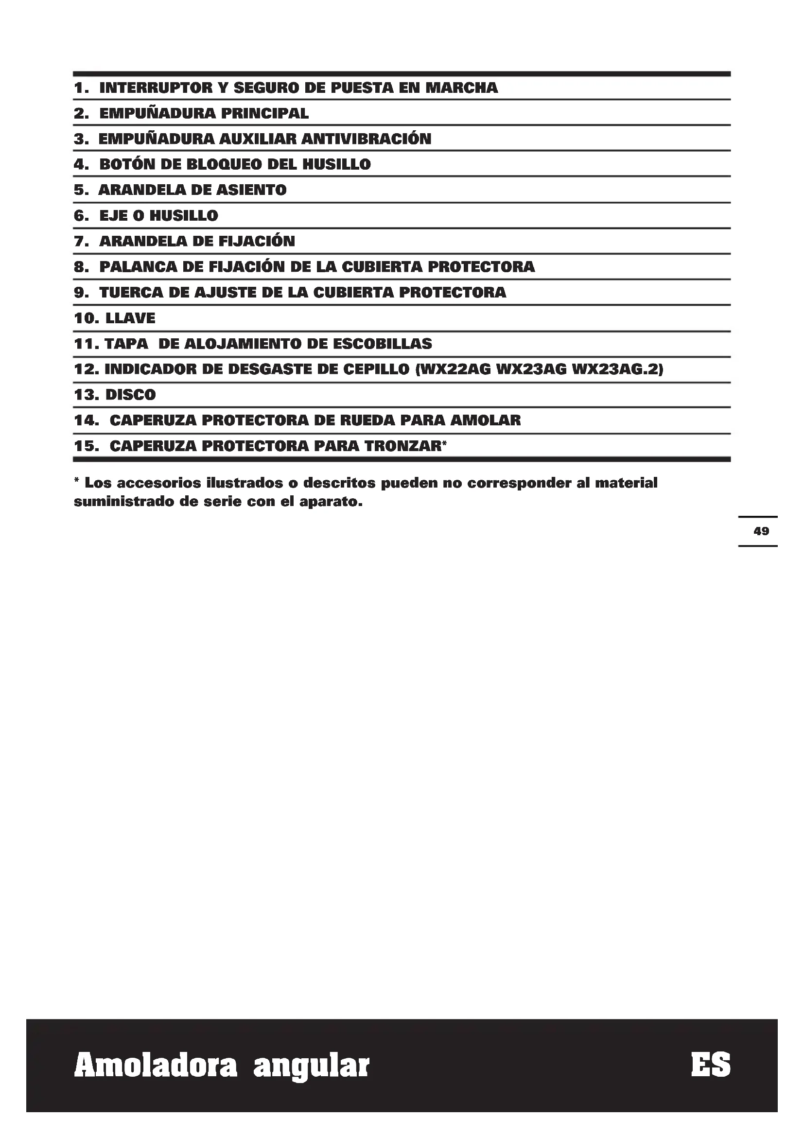 - Los accesorios ilustrados o descritos pueden no corresponder al material suministrado de serie con el aparato.Amoladora angular ES