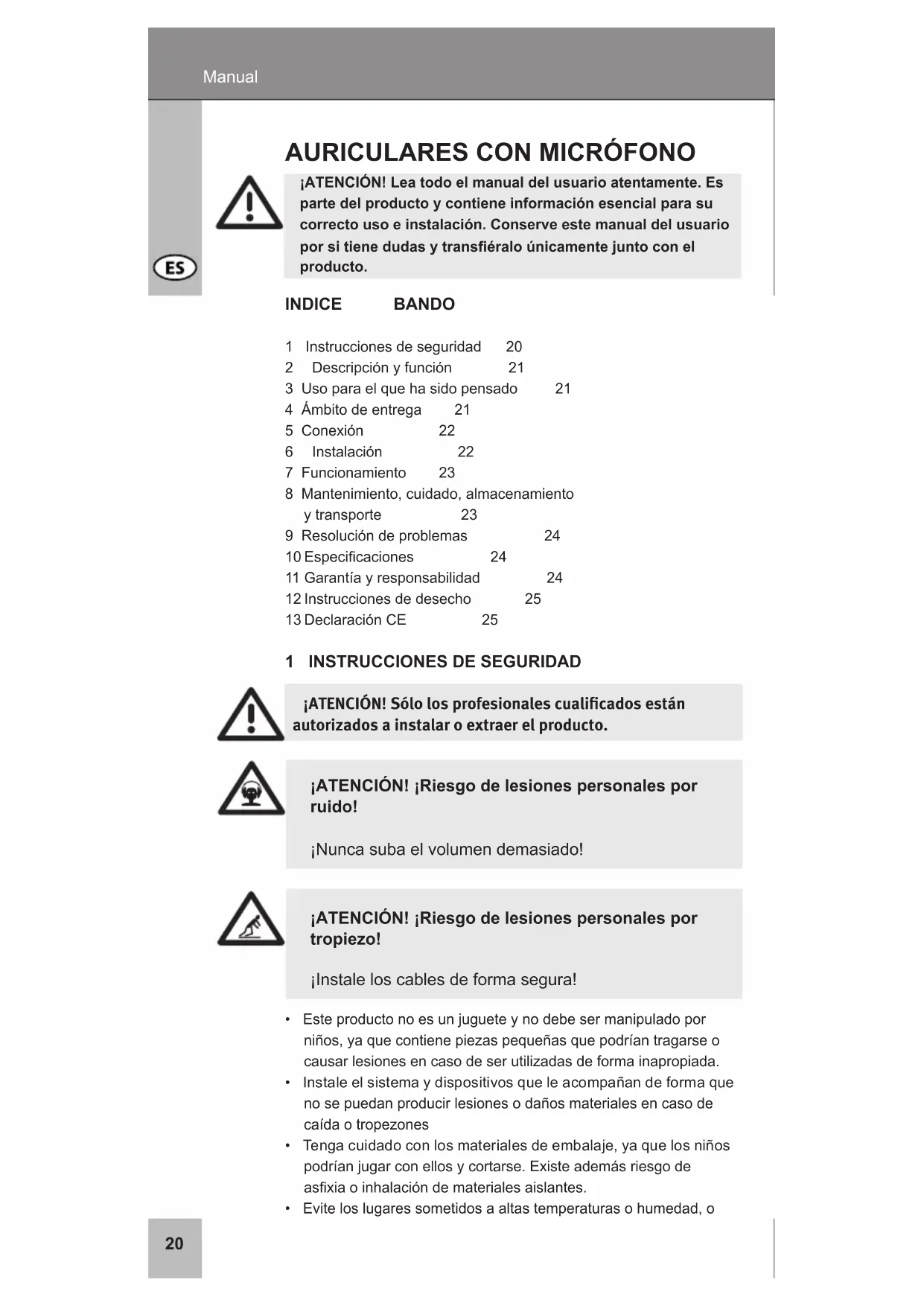 - Eviteloslugaressometidosaaltastemperaturasohumedad,o ¡ATENCIÓN! ¡Riesgo de lesiones personales por tropiezo! ¡Instaleloscablesdeformasegura! ¡ATENCIÓN! ¡Riesgo de lesiones personales por ruido! ¡Nuncasubaelvolumendemasiado!21 2 deSCRIPCIÓN Y FUNCIÓN Suproductosonunosauricularesconmicrófonouniversalesparauso multimedia.Envíeyrecibaseñalesdeaudioconlosauricularesestéreo yelmicrófonointegrados.Ajusteelproductodeformapersonalizada paraelusuario.Elproductoestáfabricadoparallamadastelefónicasy devídeoconequipos,parajugaryparaescucharmúsica. 3 USO PARA eL qUe HA SIdO PeNSAdO Quedaprohibidoelusodeestedispositivoenotroslugarestalycomo sedescribeenelcapítuloDescripciónyfunción.Utiliceelproducto solamenteensalasinterioressinhumedad.Sinosigueestas normativaseinstruccionesdeseguridadpodríanproducirseaccidentes fatales,lesionesydañospersonalesymateriales. 4 ÁMBITO de eNTReGA aquellosquepuedanentrarencontactoconagua.