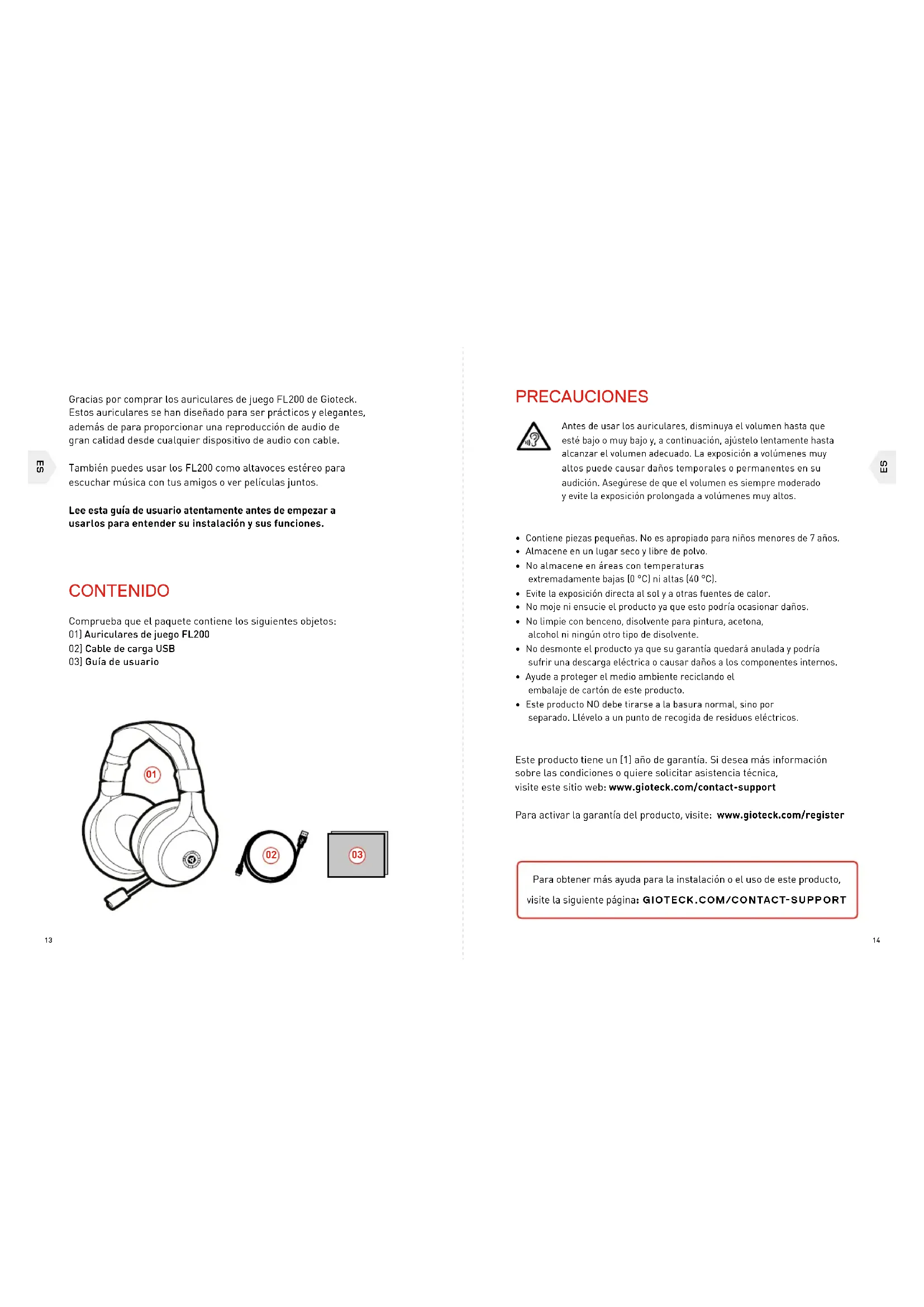 Gracias por comprar los auriculares de juego FL200 de Gioteck. Estos auriculares se han diseñado para ser prácticos y elegantes, además de para proporcionar una reproducción de audio de gran calidad desde cualquier dispositivo de audio con cable. También puedes usar los FL200 como altavoces estéreo para escuchar música con tus amigos o ver películas juntos. Lee esta guía de usuario atentamente antes de empezar a usarlos para entender su instalación y sus funciones. CONTENIDO Comprueba que el paquete contiene los siguientes objetos: 01] Auriculares de juego FL200 02] Cable de carga USB 03] Guía de usuario Antes de usar los auriculares, disminuya el volumen hasta que esté bajo o muy bajo y, a continuación, ajústelo lentamente hasta alcanzar el volumen adecuado. La exposición a volúmenes muy altos puede causar daños temporales o permanentes en su audición. Asegúrese de que el volumen es siempre moderado y evite la exposición prolongada a volúmenes muy altos.