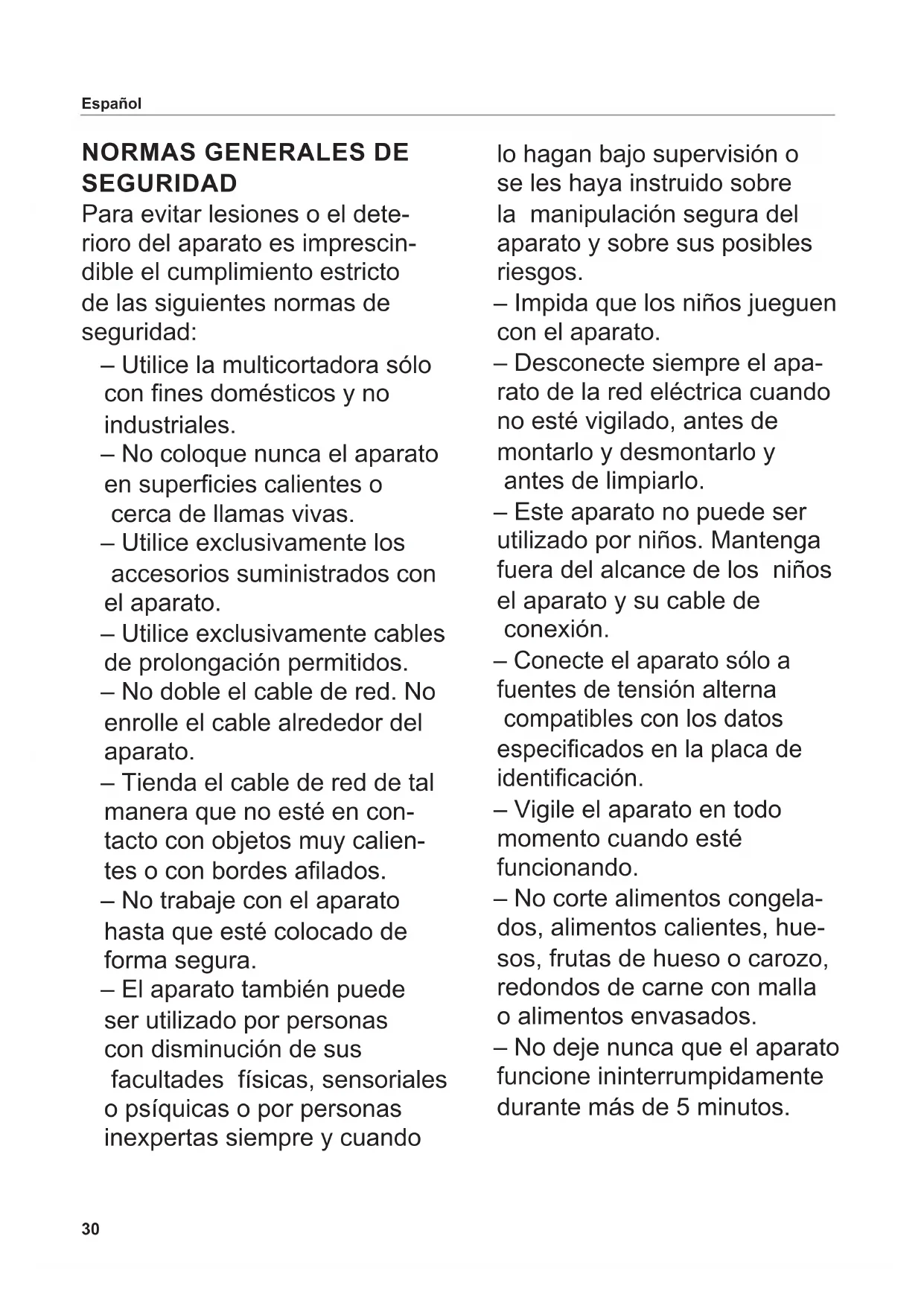 SEGURIDAD Para evitar lesiones o el dete- rioro del aparato es imprescin- dible el cumplimiento estricto de las siguientes normas de seguridad: – Utilice la multicortadora sólo con nes domésticos y no industriales. – No coloque nunca el aparato en supercies calientes o cerca de llamas vivas. – Utilice exclusivamente los accesorios suministrados con el aparato. – Utilice exclusivamente cables de prolongación permitidos. – No doble el cable de red. No enrolle el cable alrededor del aparato. – Tienda el cable de red de tal manera que no esté en con- tacto con objetos muy calien- tes o con bordes alados. – No trabaje con el aparato hasta que esté colocado de forma segura. – El aparato también puede ser utilizado por personas con disminución de sus facultades físicas, sensoriales o psíquicas o por personas inexpertas siempre y cuando lo hagan bajo supervisión o se les haya instruido sobre la manipulación segura del aparato y sobre sus posibles riesgos. – Impida que los niños jueguen con el aparato. – Desconecte siempre el apa- rato de la red eléctrica cuando no esté vigilado, antes de montarlo y desmontarlo y antes de limpiarlo. – Este aparato no puede ser utilizado por niños. Mantenga fuera del alcance de los niños el aparato y su cable de conexión. – Conecte el aparato sólo a fuentes de tensión alterna compatibles con los datos especicados en la placa de identicación. – Vigile el aparato en todo momento cuando esté funcionando. – No corte alimentos congela- dos, alimentos calientes, hue- sos, frutas de hueso o carozo, redondos de carne con malla o alimentos envasados. – No deje nunca que el aparato funcione ininterrumpidamente durante más de 5 minutos. Español31 Peligro de electrocución – Desenchufe siempre el apa- rato de la toma de corriente en caso de fallos en el funciona- miento, antes de la limpieza y cuando el aparato no esté en uso. Para ello tire del cuerpo del enchufe, no del cable. – No sumerja nunca el aparato en agua. No exponga nunca el aparato a la acción de la lluvia o de la humedad. Si el aparato hubiera caído al agua, primero desenchúfelo de la toma de corriente y después sáquelo del agua. Antes de volver a poner en funcionamiento el aparato, asegúrese de que lo revisa un servicio técnico autorizado. – No utilice el aparato con las manos húmedas. No lo utilice si está húmedo o mojado, o bien si usted se encuentra en un suelo húmedo. No utilice el aparato al aire libre. – En caso de desperfecto o ave- ría en alguna pieza del apa- rato, desconéctelo inmediata- mente y póngase en contacto con el servicio técnico de ritter. – En caso de que se dañe el cable de red, deberá reempla- zarlo el fabricante, su servicio técnico o una persona debida- mente cualicada para evitar riesgos. Riesgo de lesiones – Este aparato no debe utili- zarse sin el carro para el pro- ducto o el sujetarrestos, a no ser que el tamaño y la forma del producto no permitan su uso. – El aparato debe apagarse y desconectarse de la red eléctrica antes de sustituir los accesorios o las piezas com- plementarias que se mueven durante el funcionamiento. – La cuchilla circular está muy alada. – En ningún caso toque la cuchi- lla circular. – Desconecte el aparato antes de limpiarlo, saque el enchufe de la toma de corriente y gire el regulador del grosor de corte hasta la posición "0". – La cuchilla circular continúa funcionando durante un corto espacio de tiempo después de la desconexión. Español32 Despliegue los grácos de la cubierta anterior y posterior del folleto. Lea atentamente las instruccio- nes antes de poner en marcha el aparato. Conserve las instruccio- nes de uso y adjúntelas cuando entregue el aparato a una tercera persona. La versión actualizada de las ins- trucciones de uso se encuentra disponible en www.ritterwerk.de. FIN PREVISTO La multicortadora sirve para cortar alimentos comunes. Esta cortadora multiuso es apta para el contacto con alimentos. Cualquier utilización no apro- piada o no conforme con las instrucciones de uso puede provocar lesiones graves o deteriorar el aparato. Además, anula cualquier derecho de garantía y de reclamación de responsabilidad.
