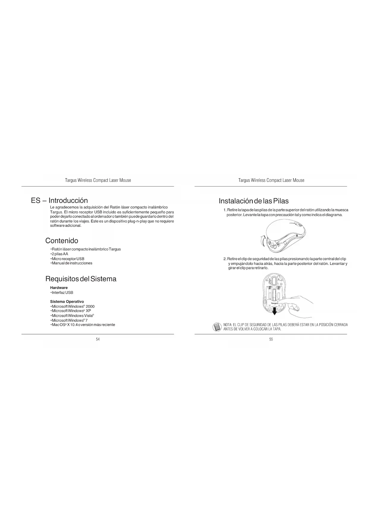 ES – Introducción Le agradecemos la adquisición del Ratón láser compacto inalámbrico Targus. El micro receptor USB incluido es sucientemente pequeño para poder dejarlo conectado al ordenador o también puede guardarlo dentro del ratón durante los viajes. Este es un dispositivo plug-n-play que no requiere software adicional. Requisitos del Sistema Hardware