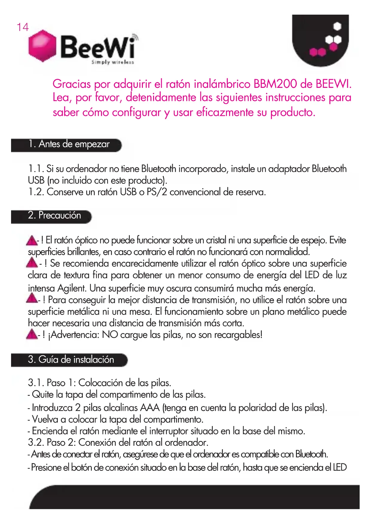 3.1. Paso 1: Colocación de las pilas. - Quite la tapa del compartimento de las pilas. - Introduzca 2 pilas alcalinas AAA (tenga en cuenta la polaridad de las pilas). - Vuelva a colocar la tapa del compartimento. - Encienda el ratón mediante el interruptor situado en la base del mismo. 3.2. Paso 2: Conexión del ratón al ordenador. - Antes de conectar el ratón, asegúrese de que el ordenador es compatible con Bluetooth. - Presione el botón de conexión situado en la base del ratón, hasta que se encienda el LED Gracias por adquirir el ratón inalámbrico BBM200 de BEEWI. Lea, por favor, detenidamente las siguientes instrucciones para saber cómo configurar y usar eficazmente su producto.15 rojo (va reduciendo la intensidad de su luz hasta apagarse, listo para emparejar). - Emparejamiento: Abra el software de utilidad Bluetooth en el ordenador y siga las instrucciones para buscar y emparejar dispositivos. - Nota: El ratón no necesita ningún código de emparejamiento para introducirlo en el ordenador; si fuese solicitado por el software de utilidad Bluetooth, sólo hay que desactivar el código de emparejamiento en la ventana de utilidad.