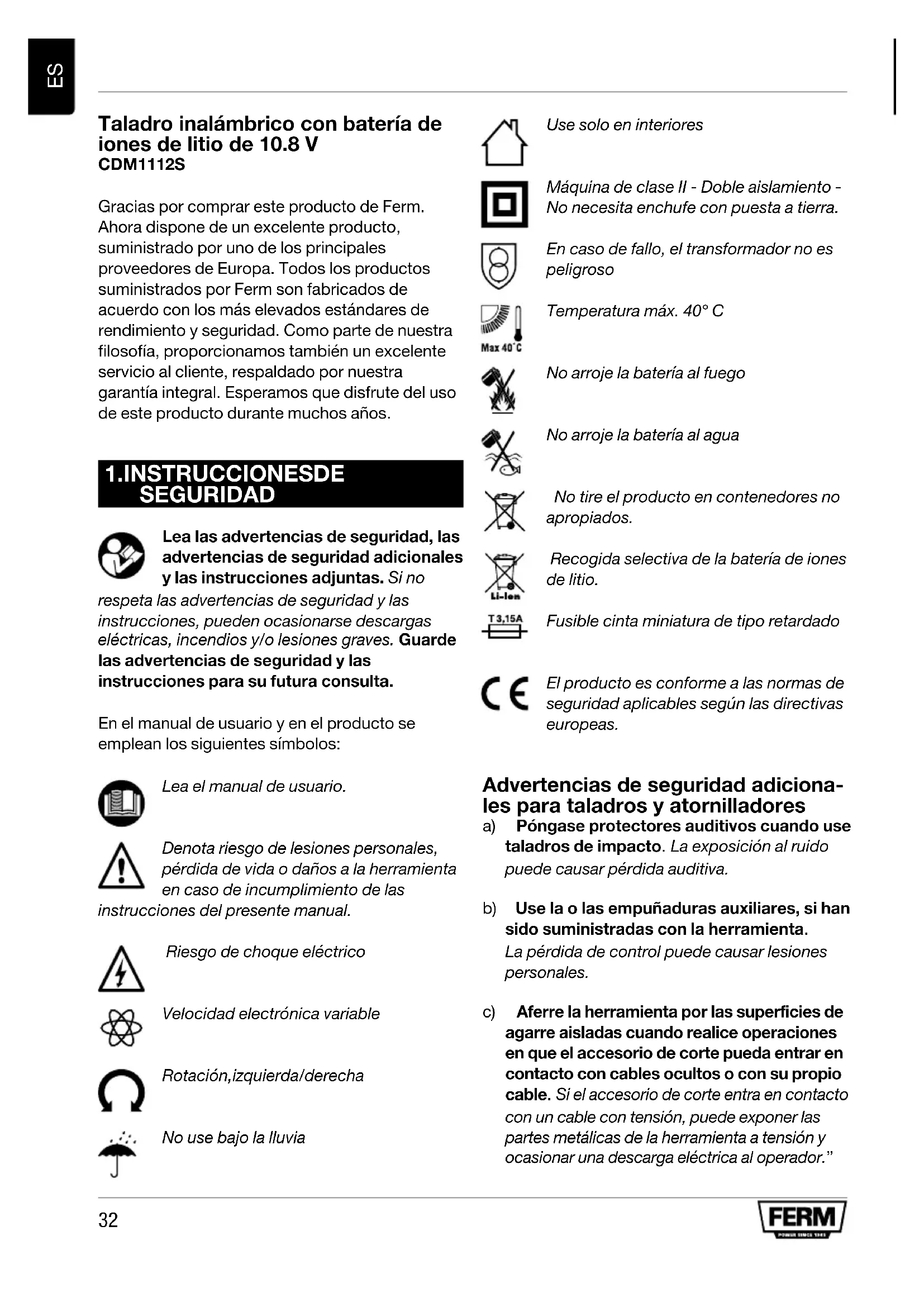 Taladro inalámbrico con batería de iones de litio de 10.8 V CDM1112S Gracias por comprar este producto de Ferm. Ahora dispone de un excelente producto, suministrado por uno de los principales proveedores de Europa. Todos los productos suministrados por Ferm son fabricados de acuerdo con los más elevados estándares de rendimiento y seguridad. Como parte de nuestra filosofía, proporcionamos también un excelente servicio al cliente, respaldado por nuestra garantía integral. Esperamos que disfrute del uso de este producto durante muchos años.