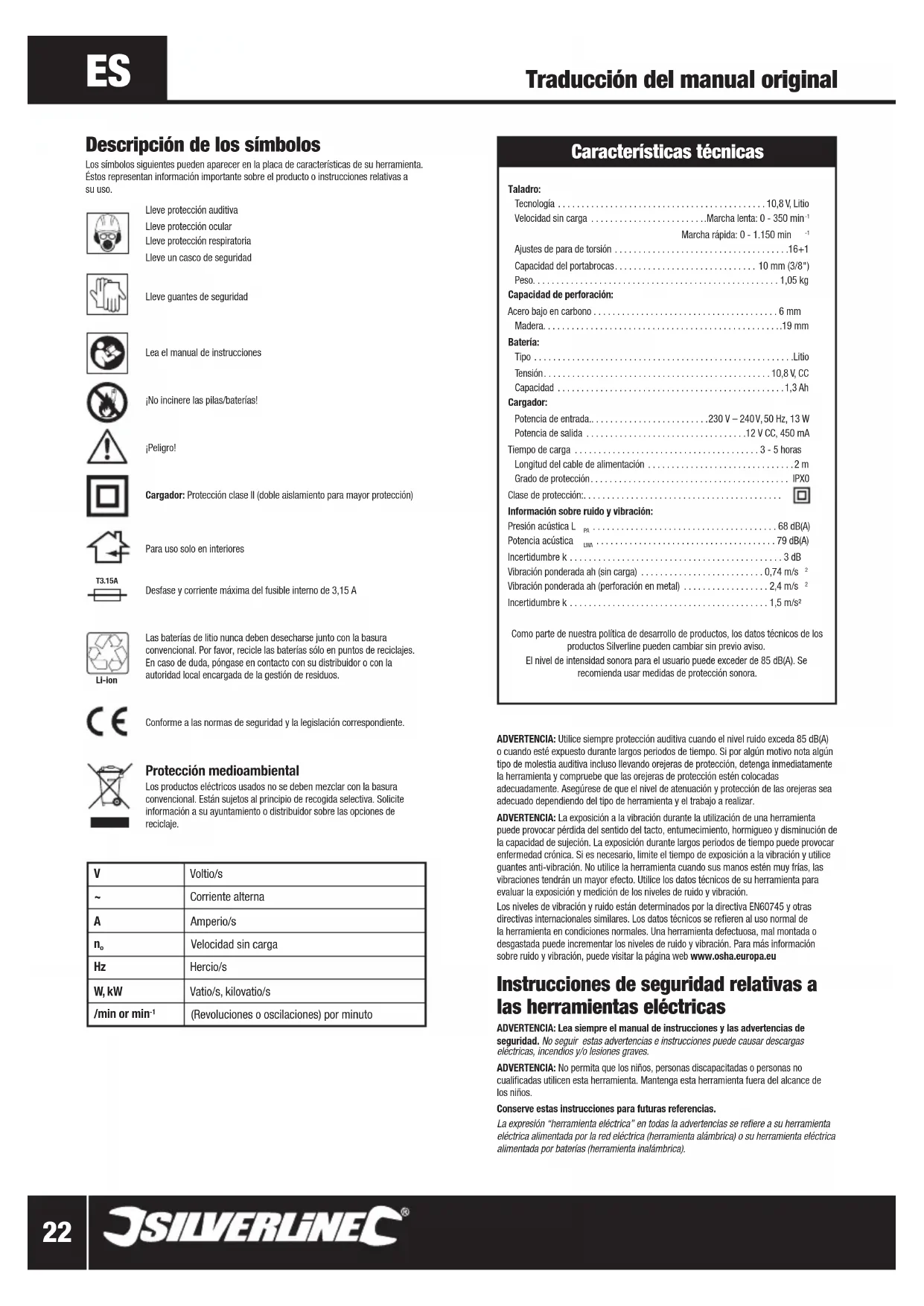 Vibración ponderada ah (perforación en metal) ..................2,4 m/s Incertidumbre k ..........................................1,5 m/s² Como parte de nuestra política de desarrollo de productos, los datos técnicos de los productos Silverline pueden cambiar sin previo aviso.El nivel de intensidad sonora para el usuario puede exceder de 85 dB(A). Se recomienda usar medidas de protección sonora. Descripción de los símbolos Los símbolos siguientes pueden aparecer en la placa de características de su herramienta. Éstos representan información importante sobre el producto o instrucciones relativas a su uso. Lleve protección auditivaLleve protección ocularLleve protección respiratoriaLleve un casco de seguridadLleve guantes de seguridadLea el manual de instrucciones¡No incinere las pilas/baterías!¡Peligro!Cargador: Protección clase II (doble aislamiento para mayor protección)Para uso solo en interioresDesfase y corriente máxima del fusible interno de 3,15 ALas baterías de litio nunca deben desecharse junto con la basura convencional. Por favor, recicle las baterías sólo en puntos de reciclajes. En caso de duda, póngase en contacto con su distribuidor o con la autoridad local encargada de la gestión de residuos.Conforme a las normas de seguridad y la legislación correspondiente.Protección medioambiental Los productos eléctricos usados no se deben mezclar con la basura convencional. Están sujetos al principio de recogida selectiva. Solicite información a su ayuntamiento o distribuidor sobre las opciones de reciclaje.Li-ion T-130˚ T3.15A V Voltio/s ~ Corriente alterna A Amperio/s