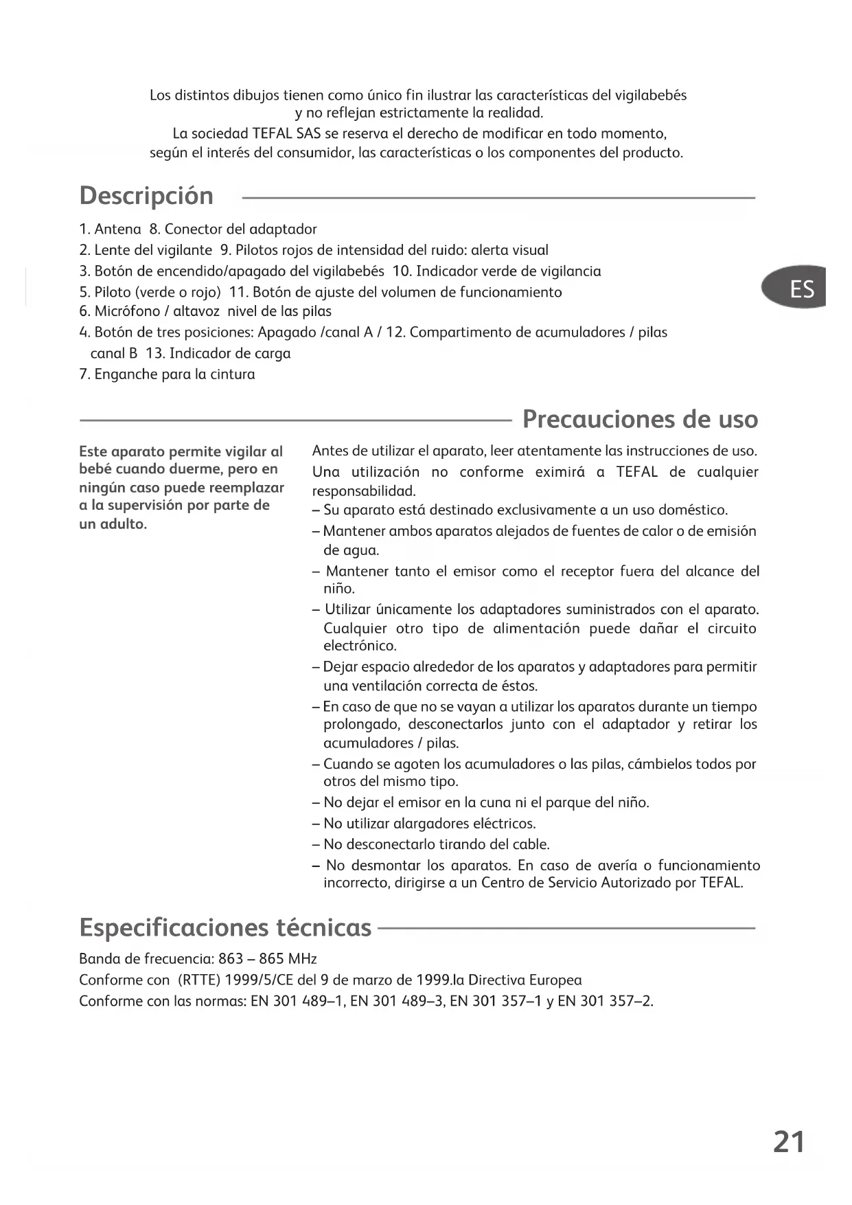 Precauciones de uso Antes de utilizar el aparato, leer atentamente las instrucciones de uso. Una utilización no conforme eximirá a TEFAL de cualquier responsabilidad. – Su aparato está destinado exclusivamente a un uso doméstico. – Mantener ambos aparatos alejados de fuentes de calor o de emisión de agua. – Mantener tanto el emisor como el receptor fuera del alcance del niño. – Utilizar únicamente los adaptadores suministrados con el aparato. Cualquier otro tipo de alimentación puede dañar el circuito electrónico. – Dejar espacio alrededor de los aparatos y adaptadores para permitir una ventilación correcta de éstos. – En caso de que no se vayan a utilizar los aparatos durante un tiempo prolongado, desconectarlos junto con el adaptador y retirar los acumuladores / pilas. – Cuando se agoten los acumuladores o las pilas, cámbielos todos por otros del mismo tipo. – No dejar el emisor en la cuna ni el parque del niño. – No utilizar alargadores eléctricos. – No desconectarlo tirando del cable. – No desmontar los aparatos. En caso de avería o funcionamiento incorrecto, dirigirse a un Centro de Servicio Autorizado por TEFAL. Especificaciones técnicas Banda de frecuencia: 863 – 865 MHz Conforme con (RTTE) 1999/5/CE del 9 de marzo de 1999.la Directiva Europea Conforme con las normas: EN 301 489–1, EN 301 489–3, EN 301 357–1 y EN 301 357–2. Este aparato permite vigilar al bebé cuando duerme, pero en ningún caso puede reemplazar a la supervisión por parte de un adulto.