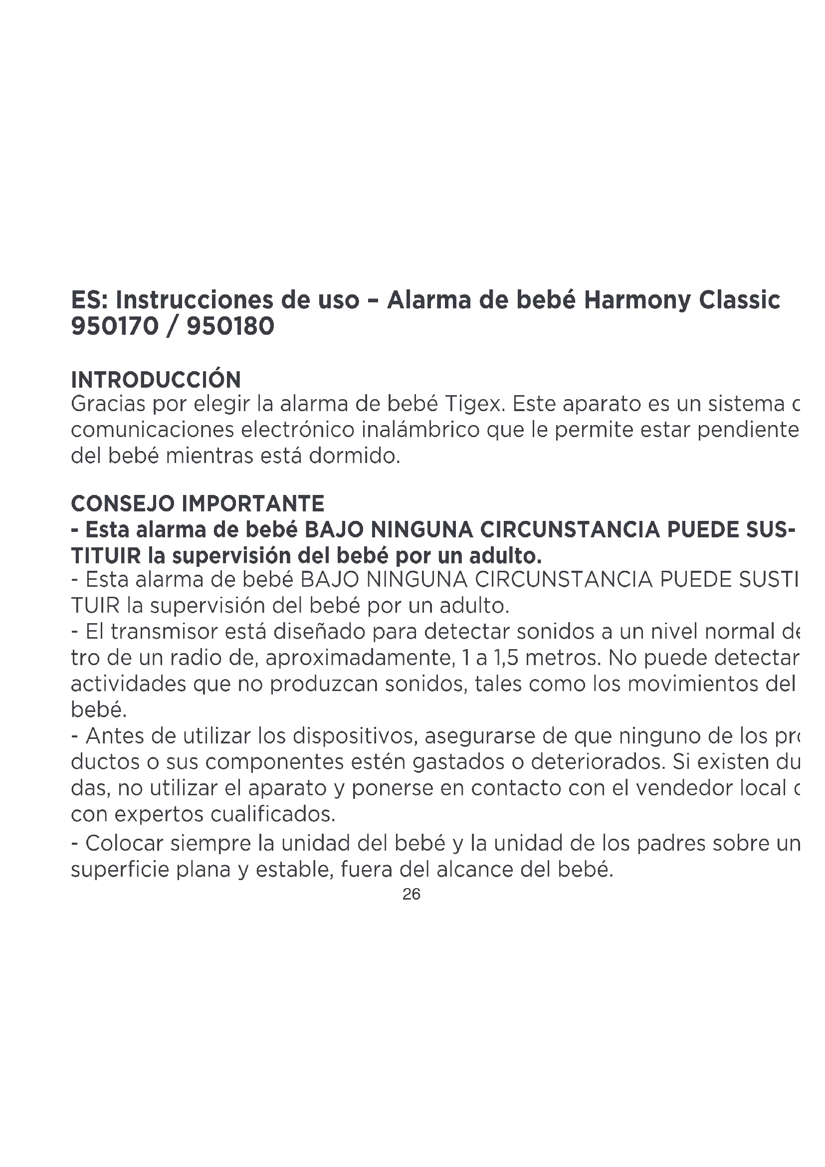 ES: Instrucciones de uso – Alarma de bebé Harmony Classic 950170 / 950180 INTRODUCCIÓN Gracias por elegir la alarma de bebé Tigex. Este aparato es un sistema de comunicaciones electrónico inalámbrico que le permite estar pendiente del bebé mientras está dormido. CONSEJO IMPORTANTE - Esta alarma de bebé BAJO NINGUNA CIRCUNSTANCIA PUEDE SUS- TITUIR la supervisión del bebé por un adulto. - Esta alarma de bebé BAJO NINGUNA CIRCUNSTANCIA PUEDE SUSTI- TUIR la supervisión del bebé por un adulto. - El transmisor está diseñado para detectar sonidos a un nivel normal den- tro de un radio de, aproximadamente, 1 a 1,5 metros. No puede detectar actividades que no produzcan sonidos, tales como los movimientos del bebé. - Antes de utilizar los dispositivos, asegurarse de que ninguno de los pro- ductos o sus componentes estén gastados o deteriorados. Si existen du- das, no utilizar el aparato y ponerse en contacto con el vendedor local o con expertos cualificados. - Colocar siempre la unidad del bebé y la unidad de los padres sobre una superficie plana y estable, fuera del alcance del bebé.27 - Asegurarse siempre de que los aparatos eléctricos y sus cables se man- tienen fuera del alcance de lo niños. - Extraer las pilas de su alojamiento cuando la unidad no se vaya a usar du- rante períodos de tiempo largos. - Para disfrutar del máximo alcance, sugerimos enchufar el transmisor a la red. El alcance del transmisor se reduce (menos de 300 metros en campo abierto) cuando funciona con las pilas. - Si hay muy poca distancia entre el receptor y el transmisor, se puede obtener un efecto Larsen (sonido muy estridente). Para evitarlo, simple- mente aumentar la distancia entre el receptor y el transmisor o bajar el vo- lumen en el receptor. - Si hay demasiada distancia entre el receptor y el transmisor, puede que se escuchen interferencias. Esto indica que se ha llegado al alcance máximo del aparato. Para solucionar este problema, simplemente reducir la distancia entre el receptor y el transmisor. - El alcance máximo es, aproximadamente, 300 m en un espacio abierto sin obstáculos. El alcance del aparato varía con arreglo a los obstáculos que se encuentren (pendiente del terreno, número de tabiques entre el transmisor y el receptor, presencia de estructuras metálicas, estado de carga de las pilas, etc.).28 - No utilizar nunca este producto en las proximidades de luces de neón u otros dispositivos eléctricos / electrónicos tales como televisores, mo- tores, PCs, teléfonos inalámbricos TDEI, etc. Éstos pueden interferir con su funcionamiento. - Es vital comprobar regularmente que la unidad del bebé y la unidad de los padres funcionan correctamente; en particular, comprobar que la se- ñal se recibe claramente y que no se ha superado la distancia máxima prevista. - El sistema no se debe usar para espiar conversaciones privadas. Este tipo de uso es estrictamente ilegal. - Rogamos leer atentamente todas las instrucciones antes de utilizar esta alarma de bebé. Conservar este folleto porque sirve de prueba de com- pra permanente y se puede usar para identificación en caso de robo. - No intentar nunca desmontar la alarma de bebé. - Mantener los aparatos bien alejados de fuentes de calor (máximo 40 °C) y de humedad. - Limpiar el aparato con un trapo suave y seco. No sumergirlo en agua ni exponerlo a goteo o salpicaduras de agua. - Los alimentadores se pueden calentar al utilizar los aparatos; al usarlos, asegurarse de que el calor se puede dispersar y no cubrirlos. - No se debe dejar caer el aparato ni someterlo a golpes fuertes. - Utilizar este producto solamente con la conexión eléctrica incluida o la suministrada como accesorio.29 - No colocar fuentes de llama abierta, tales como velas encendidas, encima del aparato. - Cuidar el medio ambiente: no tirar las pilas usadas con la basura do- méstica, desecharlas en los puntos de recogida previstos. - N.B. para evitar todo riesgo de electrocución; no exponer el aparato a la lluvia o condiciones de humedad. - Las pilas no deben estar expuestas a excesivo calor (sol, fuego, etc.) - El alimentador actúa como dispositivo aislante y debe estar fácilmente accesible. - Desenchufar siempre los alimentadores de las tomas de corriente cuando no se usen. - El interruptor de alimentación eléctrica debe estar fácilmente accesible.
