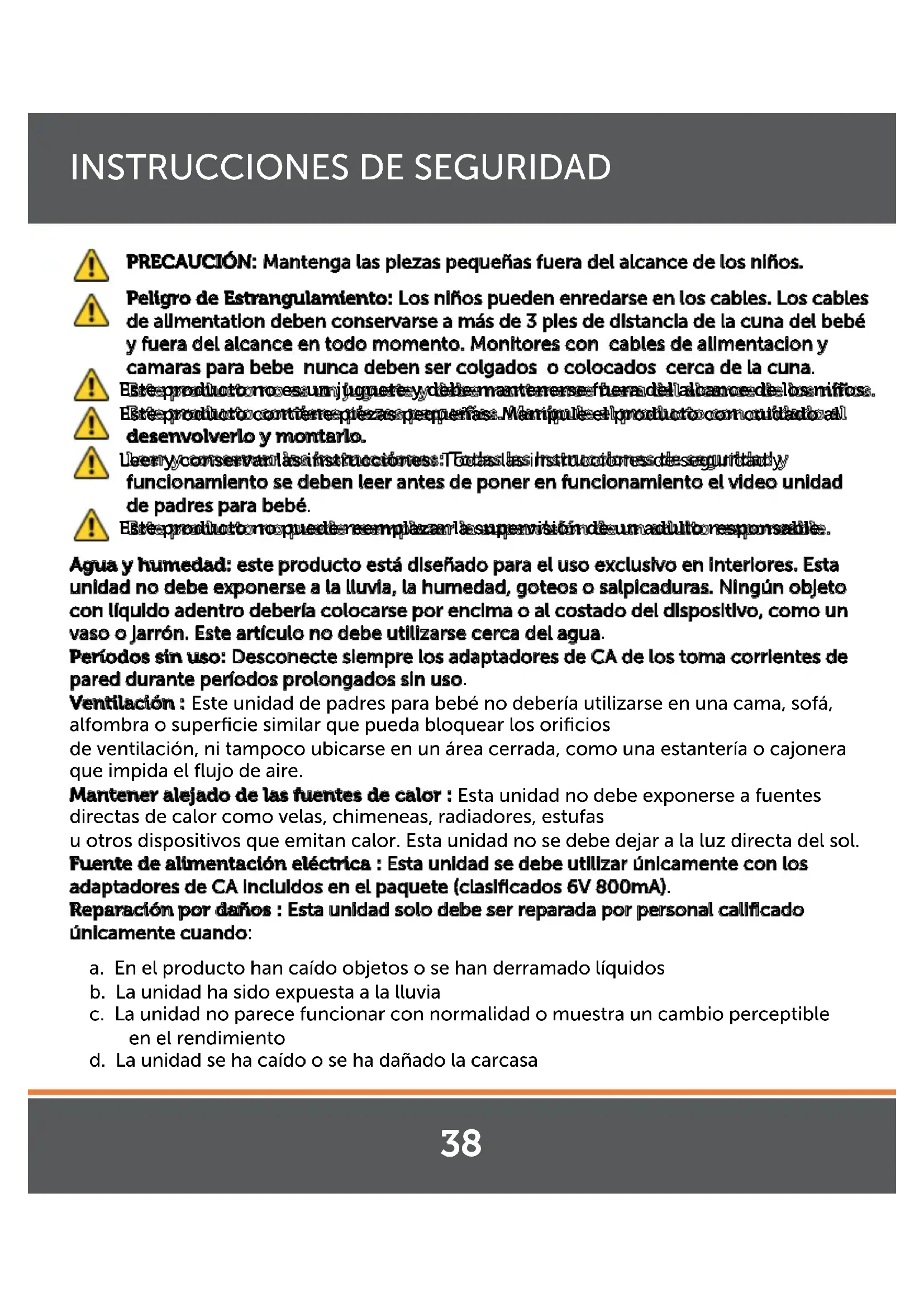 - N’utilisez jamais de détergents ou de produits solvants DÉPANNAGE 37PRECAUCIÓN: Mantenga las piezas pequeñas fuera del alcance de los niños. Peligro de Estrangulamiento: Los niños pueden enredarse en los cables. Los cables de alimentation deben conservarse a más de 3 pies de distancia de la cuna del bebé y fuera del alcance en todo momento. Monitores con cables de alimentacion y camaras para bebe nunca deben ser colgados o colocados cerca de la cuna. Este producto no es un juguete y debe mantenerse fuera del alcance de los niños. Este producto contiene piezas pequeñas. Manipule el producto con cuidado al desenvolverlo y montarlo. Leer y conservar las instrucciones: Todas las instrucciones de seguridad y funcionamiento se deben leer antes de poner en funcionamiento el video unidad de padres para bebé. Este producto no puede reemplazar la supervisión de un adulto responsable. Agua y humedad: este producto está diseñado para el uso exclusivo en interiores. Esta unidad no debe exponerse a la lluvia, la humedad, goteos o salpicaduras. Ningún objeto con líquido adentro debería colocarse por encima o al costado del dispositivo, como un vaso o jarrón. Este artículo no debe utilizarse cerca del agua. Períodos sin uso: Desconecte siempre los adaptadores de CA de los toma corrientes de pared durante períodos prolongados sin uso. Ventilación : Este unidad de padres para bebé no debería utilizarse en una cama, sofá, alfombra o superficie similar que pueda bloquear los orificios de ventilación, ni tampoco ubicarse en un área cerrada, como una estantería o cajonera que impida el flujo de aire. Mantener alejado de las fuentes de calor : Esta unidad no debe exponerse a fuentes directas de calor como velas, chimeneas, radiadores, estufas u otros dispositivos que emitan calor. Esta unidad no se debe dejar a la luz directa del sol. Fuente de alimentación eléctrica : Esta unidad se debe utilizar únicamente con los adaptadores de CA incluidos en el paquete (clasificados 6V 800mA). Reparación por daños : Esta unidad solo debe ser reparada por personal calificado únicamente cuando: a. En el producto han caído objetos o se han derramado líquidos b. La unidad ha sido expuesta a la lluvia c. La unidad no parece funcionar con normalidad o muestra un cambio perceptible en el rendimiento d. La unidad se ha caído o se ha dañado la carcasa