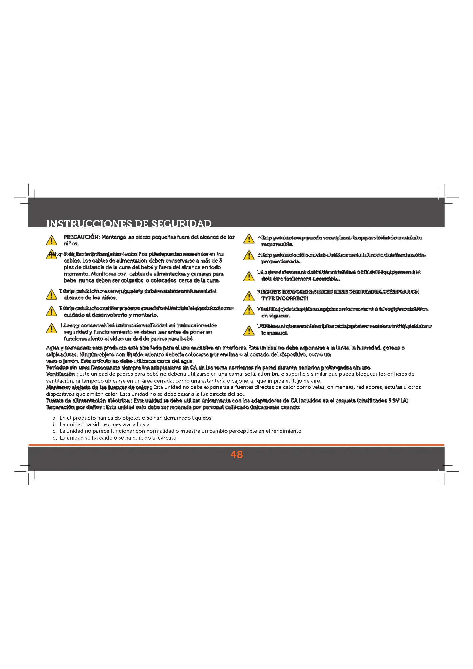 PRECAUCIÓN: Mantenga las piezas pequeñas fuera del alcance de los niños. Peligro de Estrangulamiento: Los niños pueden enredarse en los cables. Los cables de alimentation deben conservarse a más de 3 pies de distancia de la cuna del bebé y fuera del alcance en todo momento. Monitores con cables de alimentacion y camaras para bebe nunca deben ser colgados o colocados cerca de la cuna. Este producto no es un juguete y debe mantenerse fuera del alcance de los niños. Este producto contiene piezas pequeñas. Manipule el producto con cuidado al desenvolverlo y montarlo. Leer y conservar las instrucciones: Todas las instrucciones de seguridad y funcionamiento se deben leer antes de poner en funcionamiento el video unidad de padres para bebé. Este producto no puede reemplazar la supervisión de un adulto responsable. Este producto sólo se debe utilizar con la fuente de alimentación proporcionada. La prise de courant doit être installée à côté de l’équipement et doit être facilement accessible. RISQUE D’EXPLOSION SI LES PILES SONT REMPLACÉES PAR UN TYPE INCORRECT! Veuillez jetez les piles usagées conformément à la réglementation en vigueur. Utilisez uniquement les piles et adaptateurs secteurs indiqués dans le manuel. Agua y humedad: este producto está diseñado para el uso exclusivo en interiores. Esta unidad no debe exponerse a la lluvia, la humedad, goteos o salpicaduras. Ningún objeto con líquido adentro debería colocarse por encima o al costado del dispositivo, como un vaso o jarrón. Este artículo no debe utilizarse cerca del agua. Períodos sin uso: Desconecte siempre los adaptadores de CA de los toma corrientes de pared durante períodos prolongados sin uso. Ventilación : Este unidad de padres para bebé no debería utilizarse en una cama, sofá, alfombra o superficie similar que pueda bloquear los orificios de ventilación, ni tampoco ubicarse en un área cerrada, como una estantería o cajonera que impida el flujo de aire. Mantener alejado de las fuentes de calor : Esta unidad no debe exponerse a fuentes directas de calor como velas, chimeneas, radiadores, estufas u otros dispositivos que emitan calor. Esta unidad no se debe dejar a la luz directa del sol. Fuente de alimentación eléctrica : Esta unidad se debe utilizar únicamente con los adaptadores de CA incluidos en el paquete (clasificados 5.9V 1A). Reparación por daños : Esta unidad solo debe ser reparada por personal calificado únicamente cuando: a. En el producto han caído objetos o se han derramado líquidos b. La unidad ha sido expuesta a la lluvia c. La unidad no parece funcionar con normalidad o muestra un cambio perceptible en el rendimiento d. La unidad se ha caído o se ha dañado la carcasa49 Este dispositivo cumple con la sección 15 de las Normas de la FCC. El funcionamiento está sujeto a las siguientes dos condiciones: (1) Este dispositivo no puede causar una interferencia negativa (2) Este dispositivo debe aceptar cualquier interferencia recibida, incluso una que pueda causar un funcionamiento no deseado.