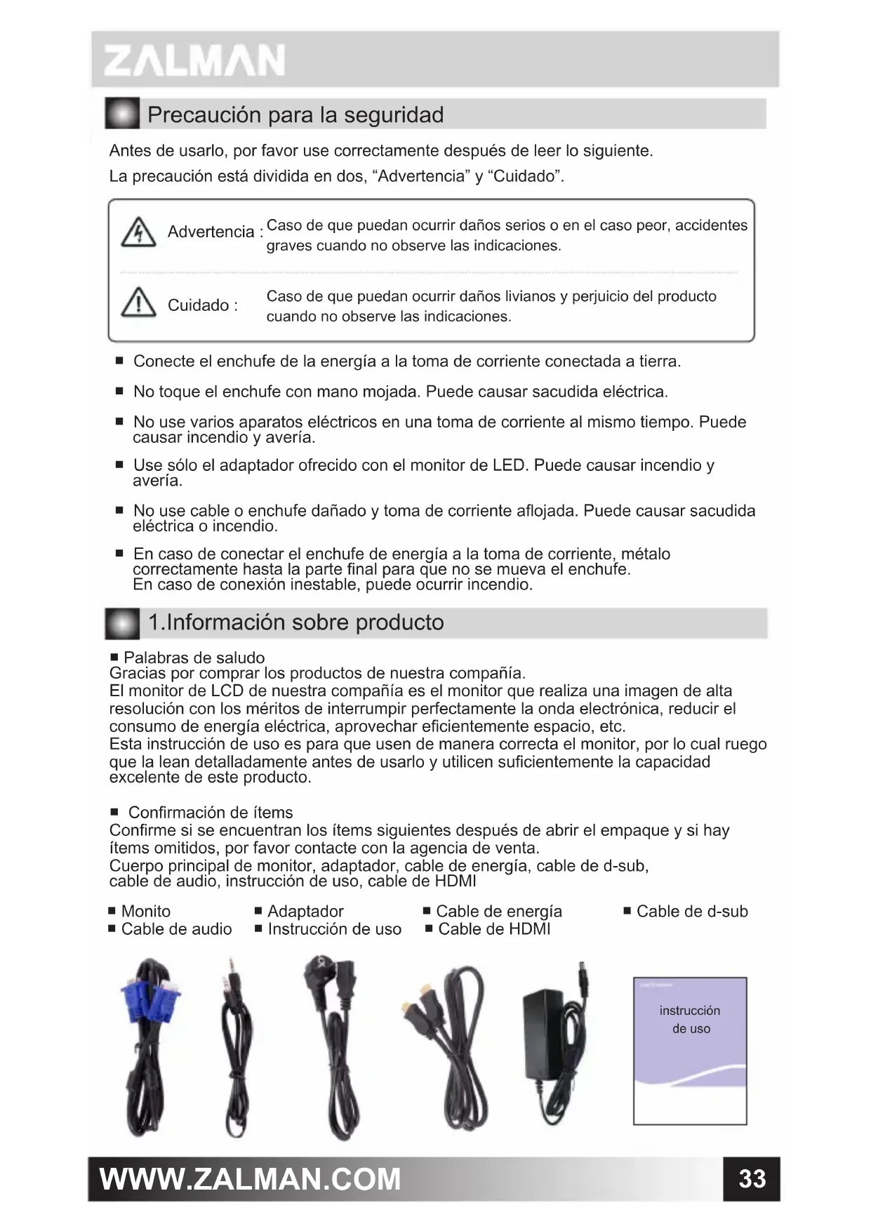 Precaución para la seguridad Antes de usarlo, por favor use correctamente después de leer lo siguiente. La precaución está dividida en dos, “Advertencia” y “Cuidado”. ■ Conecte el enchufe de la energía a la toma de corriente conectada a tierra. ■ No toque el enchufe con mano mojada. Puede causar sacudida eléctrica. ■ No use varios aparatos eléctricos en una toma de corriente al mismo tiempo. Puede causar incendio y avería. ■ Use sólo el adaptador ofrecido con el monitor de LED. Puede causar incendio y avería. ■ No use cable o enchufe dañado y toma de corriente aojada. Puede causar sacudida eléctrica o incendio. ■ En caso de conectar el enchufe de energía a la toma de corriente, métalo correctamente hasta la parte nal para que no se mueva el enchufe. En caso de conexión inestable, puede ocurrir incendio. Caso de que puedan ocurrir daños serios o en el caso peor, accidentes graves cuando no observe las indicaciones. Caso de que puedan ocurrir daños livianos y perjuicio del producto cuando no observe las indicaciones. Advertencia : Cuidado : 1.Información sobre producto ■ Palabras de saludo Gracias por comprar los productos de nuestra compañía. El monitor de LCD de nuestra compañía es el monitor que realiza una imagen de alta resolución con los méritos de interrumpir perfectamente la onda electrónica, reducir el consumo de energía eléctrica, aprovechar ecientemente espacio, etc. Esta instrucción de uso es para que usen de manera correcta el monitor, por lo cual ruego que la lean detalladamente antes de usarlo y utilicen sucientemente la capacidad excelente de este producto. ■ Conrmación de ítems Conrme si se encuentran los ítems siguientes después de abrir el empaque y si hay ítems omitidos, por favor contacte con la agencia de venta. Cuerpo principal de monitor, adaptador, cable de energía, cable de d-sub, cable de audio, instrucción de uso, cable de HDMI ■ Monito ■ Adaptador ■ Cable de energía ■ Cable de d-sub ■ Cable de audio ■ Instrucción de uso ■ Cable de HDMI instrucciónde uso34