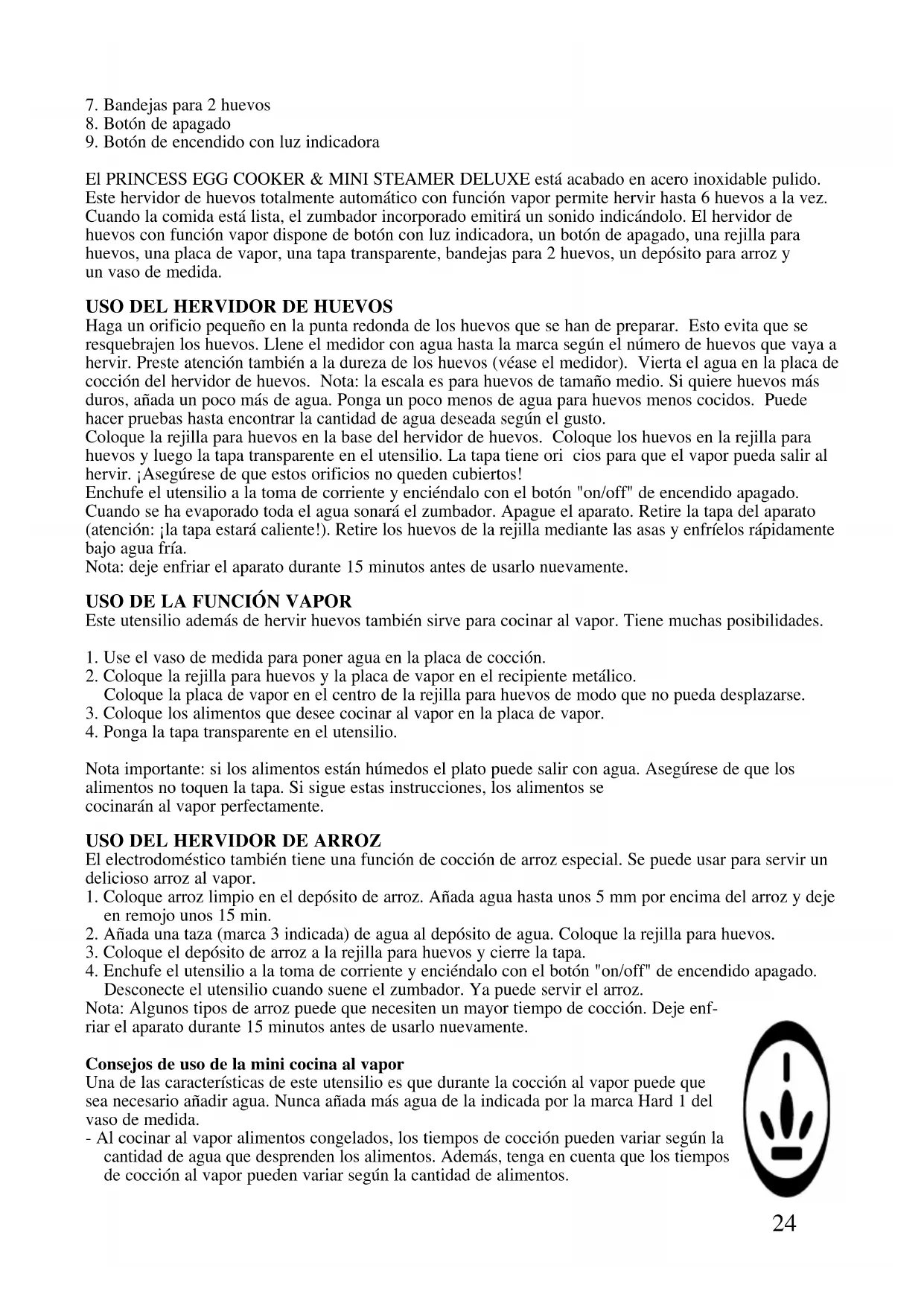 Desconecte el utensilio cuando suene el zumbador. Ya puede servir el arroz. Nota: Algunos tipos de arroz puede que necesiten un mayor tiempo de cocción. Deje enf- riar el aparato durante 15 minutos antes de usarlo nuevamente. Consejos de uso de la mini cocina al vapor Una de las características de este utensilio es que durante la cocción al vapor puede que sea necesario añadir agua. Nunca añada más agua de la indicada por la marca Hard 1 del vaso de medida. - Al cocinar al vapor alimentos congelados, los tiempos de cocción pueden variar según la cantidad de agua que desprenden los alimentos. Además, tenga en cuenta que los tiempos de cocción al vapor pueden variar según la cantidad de alimentos.25 - Con cantidades de alimentos pequeñas, aumente la cantidad de agua 1-2 niveles por encima de la cantidad recomendada. - Después de la cocción espere 15 minutos antes de volver a cocinar. - Si detiene la cocción al vapor antes de terminar la misma, desconecte el utensilio y espere a que el vapor se haya disipado antes de abrir la tapa. Tenga cuidado, la tapa puede estar muy caliente. GUÍA DE COCCIÓN AL VAPOR Producto Peso por Cantidad Volumen de agua Volumen de agua producto (g) (en frío) (congelado) Piezas grandes de carne Unos 135g 2 Hard 1 x Piezas medianas de carne Unos 65g 2 Hard 6- Medium 2 Hard 1- Hard 2 Piezas pequeñas de carne Unos 35g 3 Medium 2 Hard 3- Hard 4 Dim Sum (platillo chino variado) Unos 25g 8 Hard 6- Medium 2 Hard 5- Hard 6 Por favor, use fideos cocidos o Dim Sum (platillo chino variado). LIMPIEZA ¡PRIMERO DESENCHUFE LA CLAVIJA DE LA TOMA DE CORRIENTE! La parte exterior del pie se puede limpiar con un trapo húmedo (no sumerja nunca en agua u otro líquido). Los componentes sueltos también se pueden limpiar con un trapo húmedo. Si es necesario, estos componentes se pueden limpiar también en agua jabonosa caliente. Retire la cal de la placa de cocción después de cada uso. Si la incrustación calcárea se acumula, llene la placa de cocción con una mezcla de 50% de agua y 50% de vinagre. Para hacer esto no coloque la rejilla para huevos ni la tapa sobre el utensilio. Enchufe el utensilio a la toma de corriente y deje cocer la mezcla unos pocos minutos. Repítalo varias veces. Después lave bien la placa de cocción con agua. CONSEJOS PRINCESS - No sumerja nunca la base del utensilio en agua u otro líquido. - Desenchufe siempre el aparato antes de limpiarlo y en caso de anomalías. - No cubra nunca los orificios para el vapor de la tapa. - Tenga en cuenta que el vapor que hay debajo de la tapa sale por los orificios. - La tapa se calienta mucho durante la cocción al vapor. No abra la tapa hasta que haya terminado. - Desconecte siempre el utensilio cuando suene el zumbador. Si deja conectado el zumbador durante mucho rato puede que se estropee. - Deje enfriar completamente el utensilio antes de recogerlo. - Deje enfriar el aparato durante 15 minutos antes de usarlo nuevamente. - El borde interior y los diversos componentes se calientan mucho. Asegúrese de que no quede al alcance de los niños y tenga cuidado también usted. - Asegúrese de no dejar el aparato muy cerca del borde de la mesa, encimera, etc. para que nadie lo pueda volcar. No deje el cable colgando o en el suelo para evitar que alguien pueda tropezar con el mismo. - No use el aparato si éste o el cable están dañados. En tal caso, llévelo a nuestro servicio técnico. - No coloque el aparato sobre o muy cerca de una placa de cocina caliente o cualquier fuente de calor. - Conecte este aparato únicamente a un enchufe con toma de tierra. - Este aparato sólo está indicado para un uso doméstico normal. - Los niños deberán estar vigilados para evitar que no jueguen con el aparato. - El uso de este aparato por niños o personas con alguna discapacidad física, sensorial, mental o motora, o con falta de experiencia o conocimientos puede implicar riesgos. Las personas responsables de su seguridad deberán proporcionar instrucciones explícitas o supervisar el uso del aparato.26 RECETAS: HUEVO "ESCALFADO" AL VAPOR, SALCHICHA Y ESPÁRRAGO (1 RACIÓN) 1 huevo (roto en bandeja metálica) 1-2 trocitos de espárrago 2-3 salchichas tipo perrito caliente Sal y pimienta al gusto Método