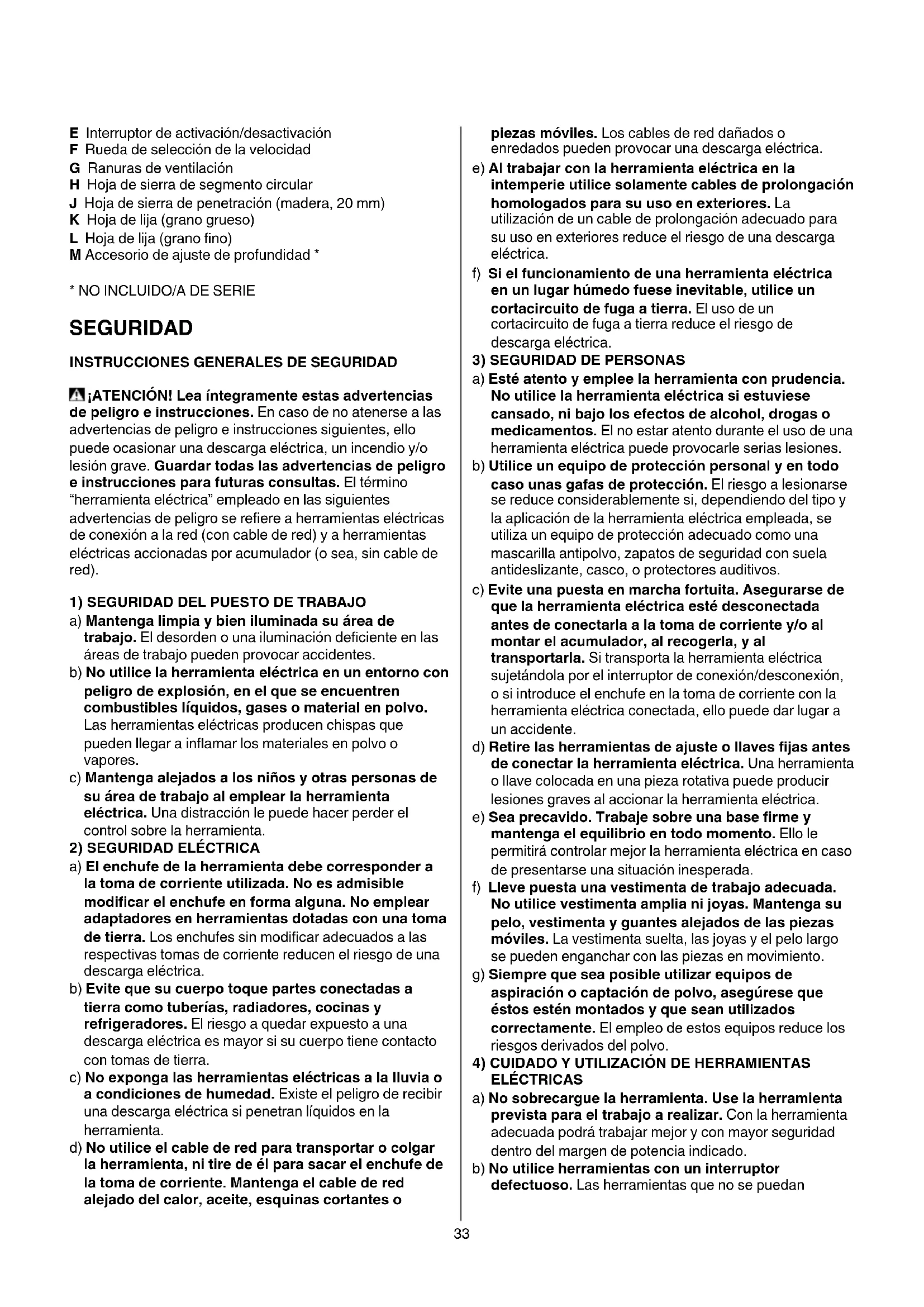 ELÉCTRICAS a) No sobrecargue la herramienta. Use la herramienta prevista para el trabajo a realizar. Con la herramienta adecuada podrá trabajar mejor y con mayor seguridad dentro del margen de potencia indicado. b) No utilice herramientas con un interruptor defectuoso. Las herramientas que no se puedan34 conectar o desconectar son peligrosas y deben repararse. c) Saque el enchufe de la red y/o desmonte el acumulador antes de realizar un ajuste en la herramienta eléctrica, cambiar de accesorio o al guardar la herramienta eléctrica. Esta medida preventiva reduce el riesgo de conectar accidentalmente la herramienta. d) Guarde las herramientas fuera del alcance de los niños y de las personas que no estén familiarizadas con su uso. Las herramientas utilizadas por personas inexpertas son peligrosas. e) Cuide sus herramientas con esmero. Controle si funcionan correctamente, sin atascarse, las partes móviles de la herramienta, y si existen partes rotas o deterioradas que pudieran afectar al funcionamiento de la herramienta. Si la herramienta eléctrica estuviese defectuosa haga repararla antes de volver a utilizarla. Muchos de los accidentes se deben a herramientas con un mantenimiento deciente. f) Mantenga los útiles limpios y afilados. Los útiles mantenidos correctamente se dejan guiar y controlar mejor. g) Utilice herramientas eléctricas, accesorios, útiles, etc. de acuerdo con estas instrucciones, teniendo en cuenta las condiciones de trabajo y la tarea a realizar. El uso de herramientas eléctricas para trabajos diferentes de aquellos para los que han sido concebidas puede resultar peligroso.