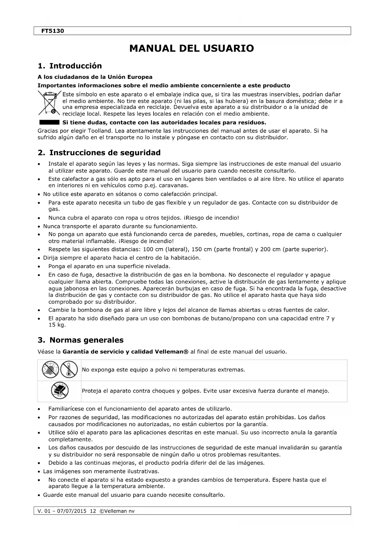 Utilice este aparato sólo con los accesorios originales. Velleman NV no será responsable de daños ni lesiones causados por un uso (indebido) de este aparato. Para más información sobre este producto y la versión más reciente de este manual del usuario, visite nuestra página www.toolland.eu. Se pueden modificar las especificaciones y el contenido de este manual sin previo aviso.