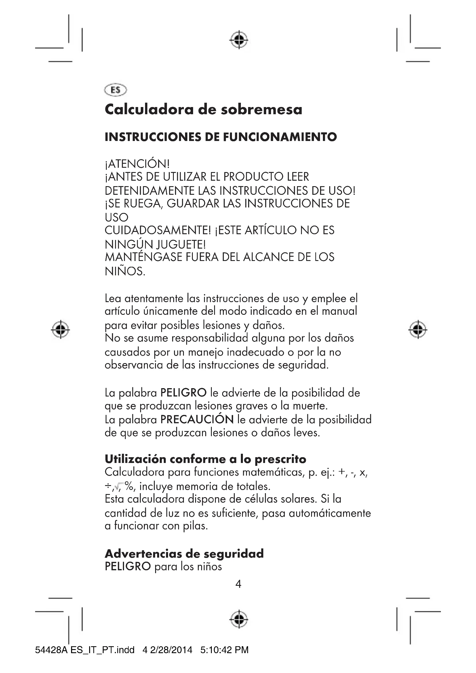 NINGÚN JUGUETE! MANTÉNGASE FUERA DEL ALCANCE DE LOS NIÑOS. Lea atentamente las instrucciones de uso y emplee el artículo únicamente del modo indicado en el manual para evitar posibles lesiones y daños. No se asume responsabilidad alguna por los daños causados por un manejo inadecuado o por la no observancia de las instrucciones de seguridad. La palabra PELIGRO le advierte de la posibilidad de que se produzcan lesiones graves o la muerte. La palabra PRECAUCIÓN le advierte de la posibilidad de que se produzcan lesiones o daños leves. Utilización conforme a lo prescrito Calculadora para funciones matemáticas, p. ej.: +, -, x, ÷, , %, incluye memoria de totales. Esta calculadora dispone de células solares. Si la cantidad de luz no es suficiente, pasa automáticamente a funcionar con pilas. Advertencias de seguridad PELIGRO para los niños 54428A ES_IT_PT.indd 4 2/28/2014 5:10:42 PM5