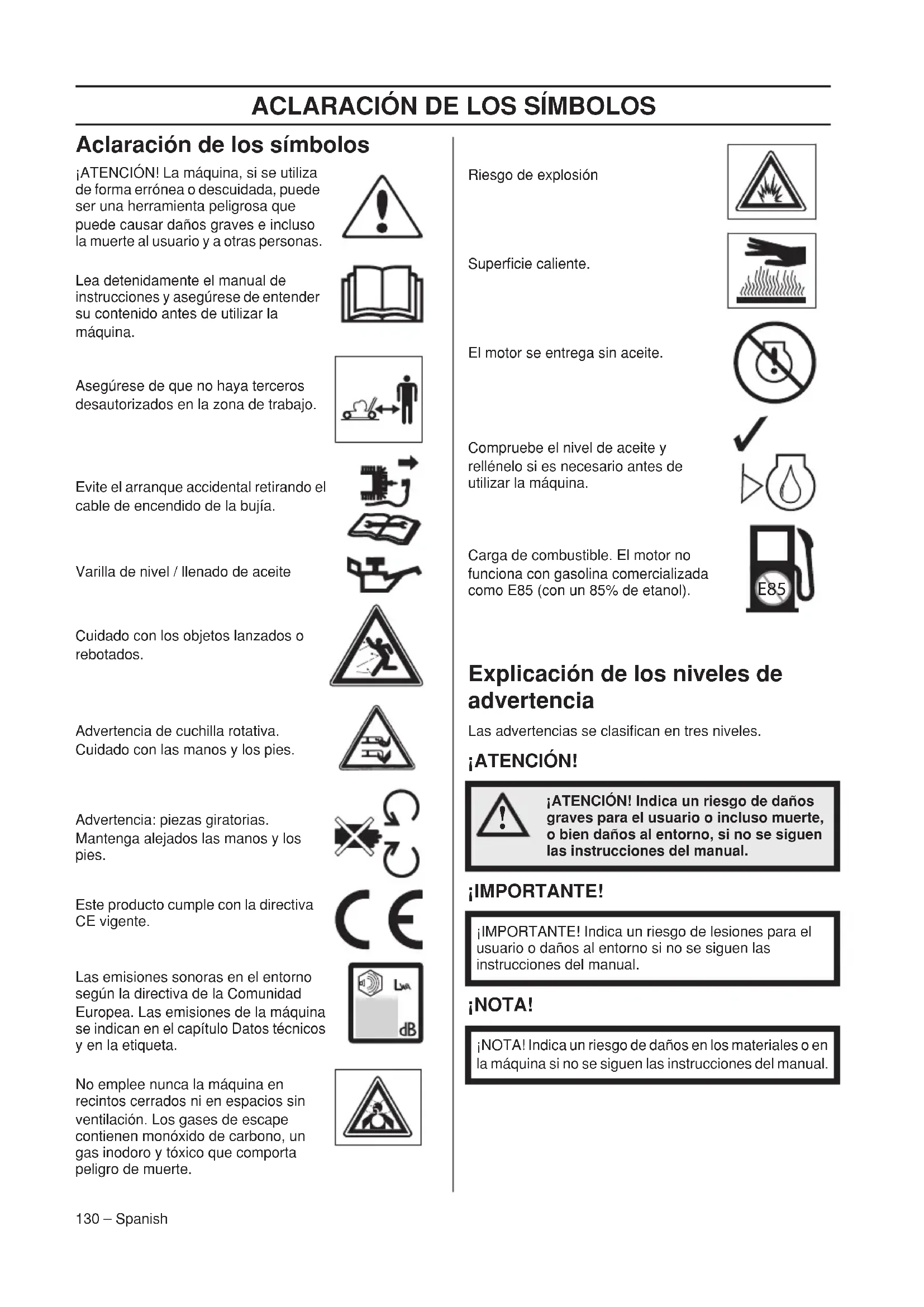 Advertencia: piezas giratorias. Mantenga alejados las manos y los pies. Este producto cumple con la directiva CE vigente. Las emisiones sonoras en el entorno según la directiva de la Comunidad Europea. Las emisiones de la máquina se indican en el capítulo Datos técnicos y en la etiqueta. No emplee nunca la máquina en recintos cerrados ni en espacios sin ventilación. Los gases de escape contienen monóxido de carbono, un gas inodoro y tóxico que comporta peligro de muerte.