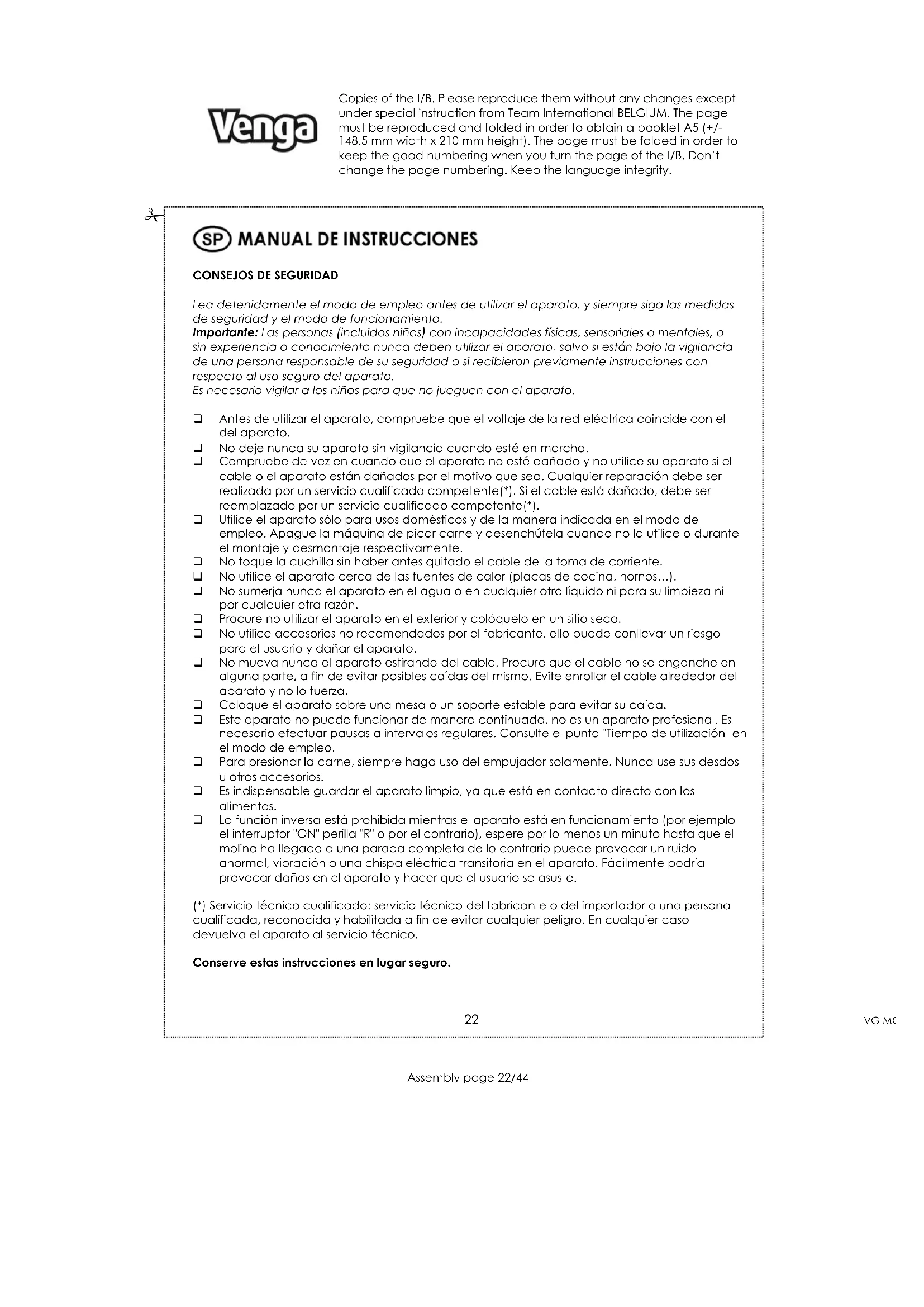 Lea detenidamente el modo de empleo antes de utilizar el aparato, y siempre siga las medidas de seguridad y el modo de funcionamiento. Importante: Las personas (incluidos niños) con incapacidades físicas, sensoriales o mentales, o sin experiencia o conocimiento nunca deben utilizar el aparato, salvo si están bajo la vigilancia de una persona responsable de su seguridad o si recibieron previamente instrucciones con respecto al uso seguro del aparato. Es necesario vigilar a los niños para que no jueguen con el aparato. Antes de utilizar el aparato, compruebe que el voltaje de la red eléctrica coincide con el del aparato. No deje nunca su aparato sin vigilancia cuando esté en marcha. Compruebe de vez en cuando que el aparato no esté dañado y no utilice su aparato si el cable o el aparato están dañados por el motivo que sea. Cualquier reparación debe ser realizada por un servicio cualificado competente(*). Si el cable está dañado, debe ser reemplazado por un servicio cualificado competente(*). Utilice el aparato sólo para usos domésticos y de la manera indicada en el modo de empleo. Apague la máquina de picar carne y desenchúfela cuando no la utilice o durante el montaje y desmontaje respectivamente. No toque la cuchilla sin haber antes quitado el cable de la toma de corriente. No utilice el aparato cerca de las fuentes de calor (placas de cocina, hornos…). No sumerja nunca el aparato en el agua o en cualquier otro líquido ni para su limpieza ni por cualquier otra razón. Procure no utilizar el aparato en el exterior y colóquelo en un sitio seco. No utilice accesorios no recomendados por el fabricante, ello puede conllevar un riesgo para el usuario y dañar el aparato. No mueva nunca el aparato estirando del cable. Procure que el cable no se enganche en alguna parte, a fin de evitar posibles caídas del mismo. Evite enrollar el cable alrededor del aparato y no lo tuerza. Coloque el aparato sobre una mesa o un soporte estable para evitar su caída. Este aparato no puede funcionar de manera continuada, no es un aparato profesional. Es necesario efectuar pausas a intervalos regulares. Consulte el punto "Tiempo de utilización" en el modo de empleo. Para presionar la carne, siempre haga uso del empujador solamente. Nunca use sus desdos u otros accesorios. Es indispensable guardar el aparato limpio, ya que está en contacto directo con los alimentos. La función inversa está prohibida mientras el aparato está en funcionamiento (por ejemplo el interruptor "ON" perilla "R" o por el contrario), espere por lo menos un minuto hasta que el molino ha llegado a una parada completa de lo contrario puede provocar un ruido anormal, vibración o una chispa eléctrica transitoria en el aparato. Fácilmente podría provocar daños en el aparato y hacer que el usuario se asuste. (*) Servicio técnico cualificado: servicio técnico del fabricante o del importador o una persona cualificada, reconocida y habilitada a fin de evitar cualquier peligro. En cualquier caso devuelva el aparato al servicio técnico. Conserve estas instrucciones en lugar seguro. Assembly page 22/44Copies of the I/B. Please reproduce them without any changes except under special instruction from Team International BELGIUM. The page must be reproduced and folded in order to obtain a booklet A5 (+/-