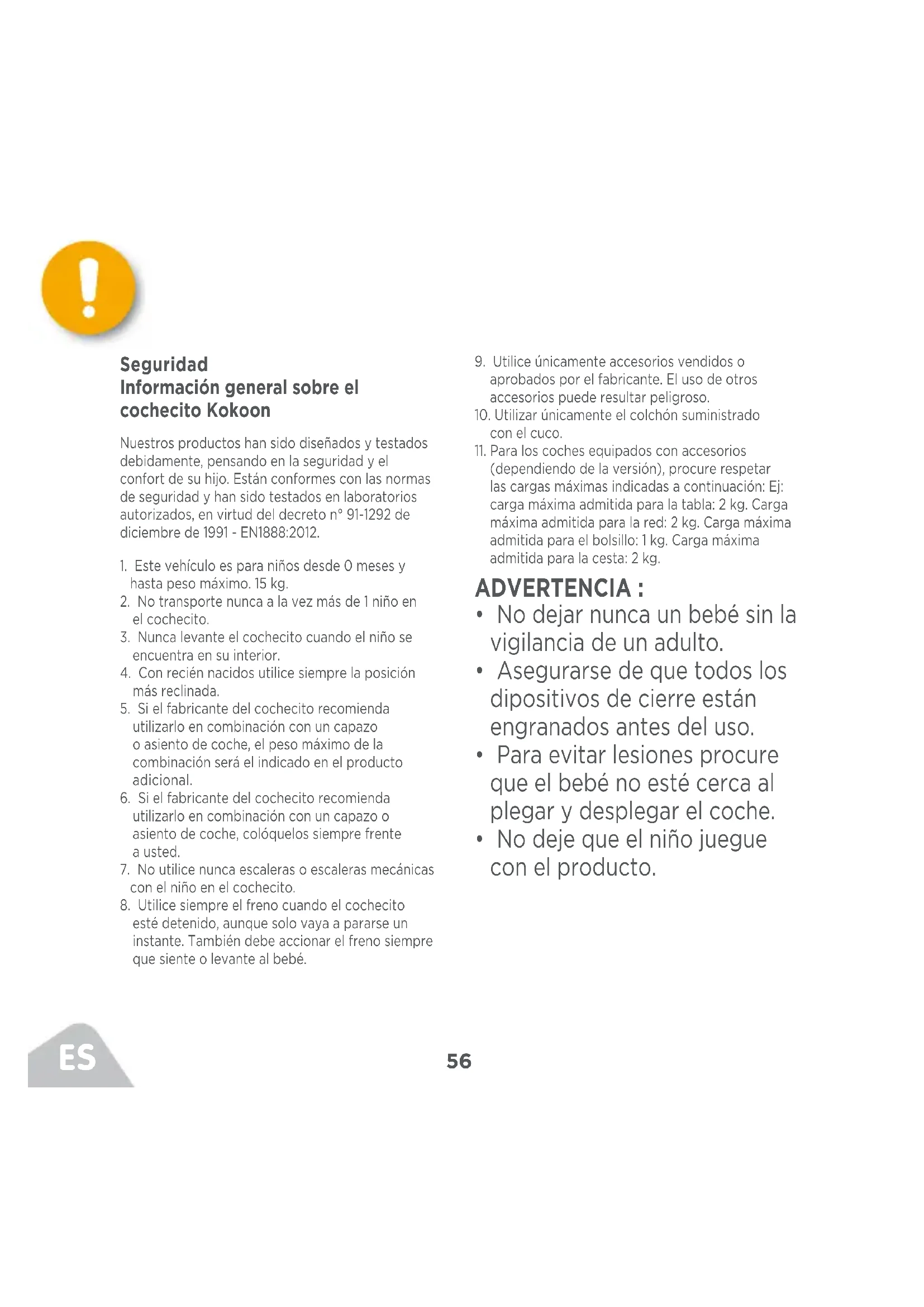 Seguridad Información general sobre el cochecito Kokoon Nuestros productos han sido diseñados y testados debidamente, pensando en la seguridad y el confort de su hijo. Están conformes con las normas de seguridad y han sido testados en laboratorios autorizados, en virtud del decreto n° 91-1292 de diciembre de 1991 - EN1888:2012.