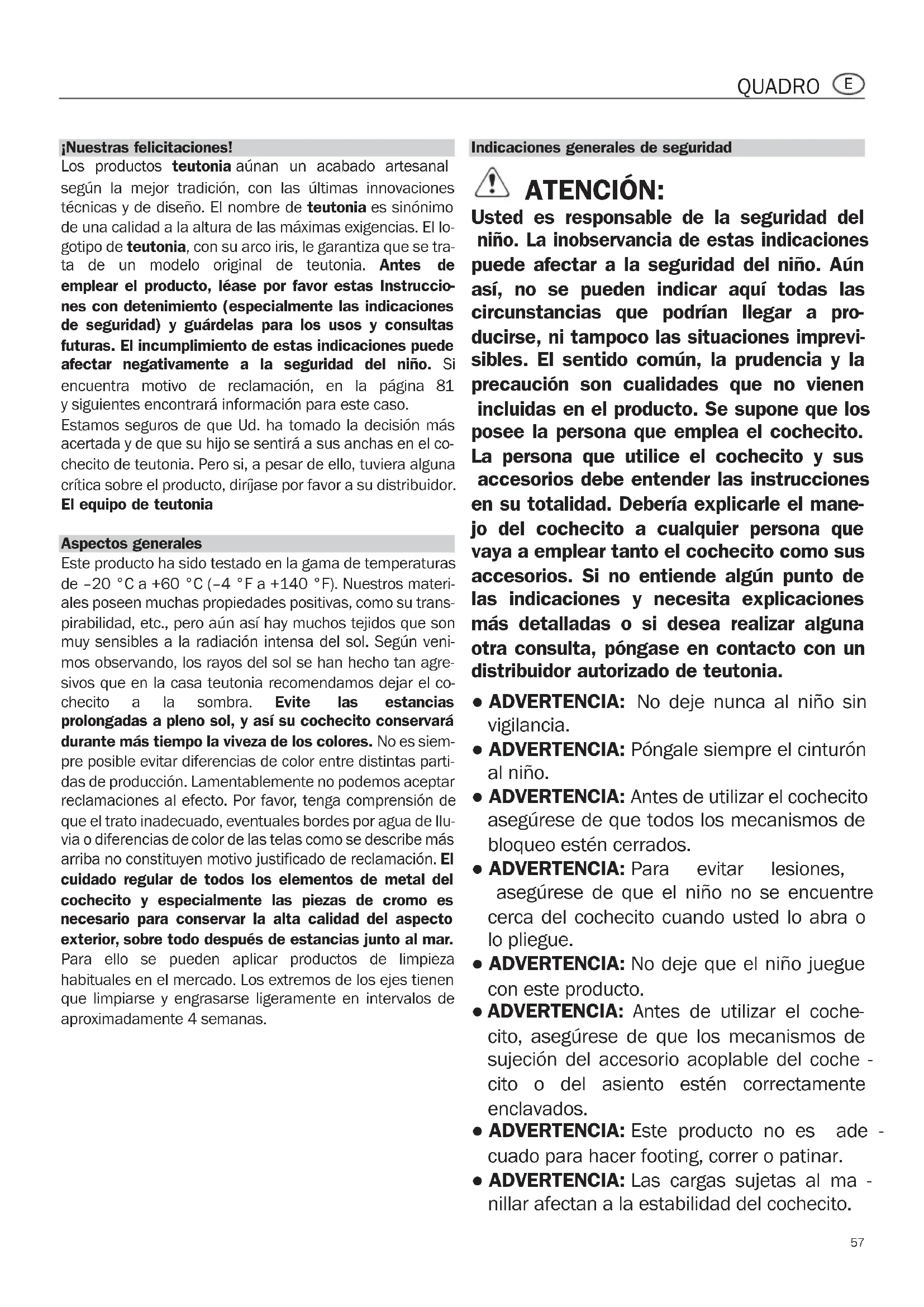 y siguientes encontrará información para este caso. Estamos seguros de que Ud. ha tomado la decisión más acertada y de que su hijo se sentirá a sus anchas en el co- checito de teutonia. Pero si, a pesar de ello, tuviera alguna crítica sobre el producto, diríjase por favor a su distribuidor. El equipo de teutonia Aspectos generales Este producto ha sido testado en la gama de temperaturas de –20 °C a +60 °C (–4 °F a +140 °F). Nuestros materi- ales poseen muchas propiedades positivas, como su trans- pirabilidad, etc., pero aún así hay muchos tejidos que son muy sensibles a la radiación intensa del sol. Según veni- mos observando, los rayos del sol se han hecho tan agre- sivos que en la casa teutonia recomendamos dejar el co- checito a la sombra. Evite las estancias prolongadas a pleno sol, y así su cochecito conservará durante más tiempo la viveza de los colores. No es siem- pre posible evitar diferencias de color entre distintas parti- das de producción. Lamentablemente no podemos aceptar reclamaciones al efecto. Por favor, tenga comprensión de que el trato inadecuado, eventuales bordes por agua de llu- via o diferencias de color de las telas como se describe más arriba no constituyen motivo justificado de reclamación. El cuidado regular de todos los elementos de metal del cochecito y especialmente las piezas de cromo es necesario para conservar la alta calidad del aspecto exterior, sobre todo después de estancias junto al mar. Para ello se pueden aplicar productos de limpieza habituales en el mercado. Los extremos de los ejes tienen que limpiarse y engrasarse ligeramente en intervalos de aproximadamente 4 semanas. Quadro_in_mistral_s_08_in.qxd 12.10.11 13:39 Seite 57QUADRO