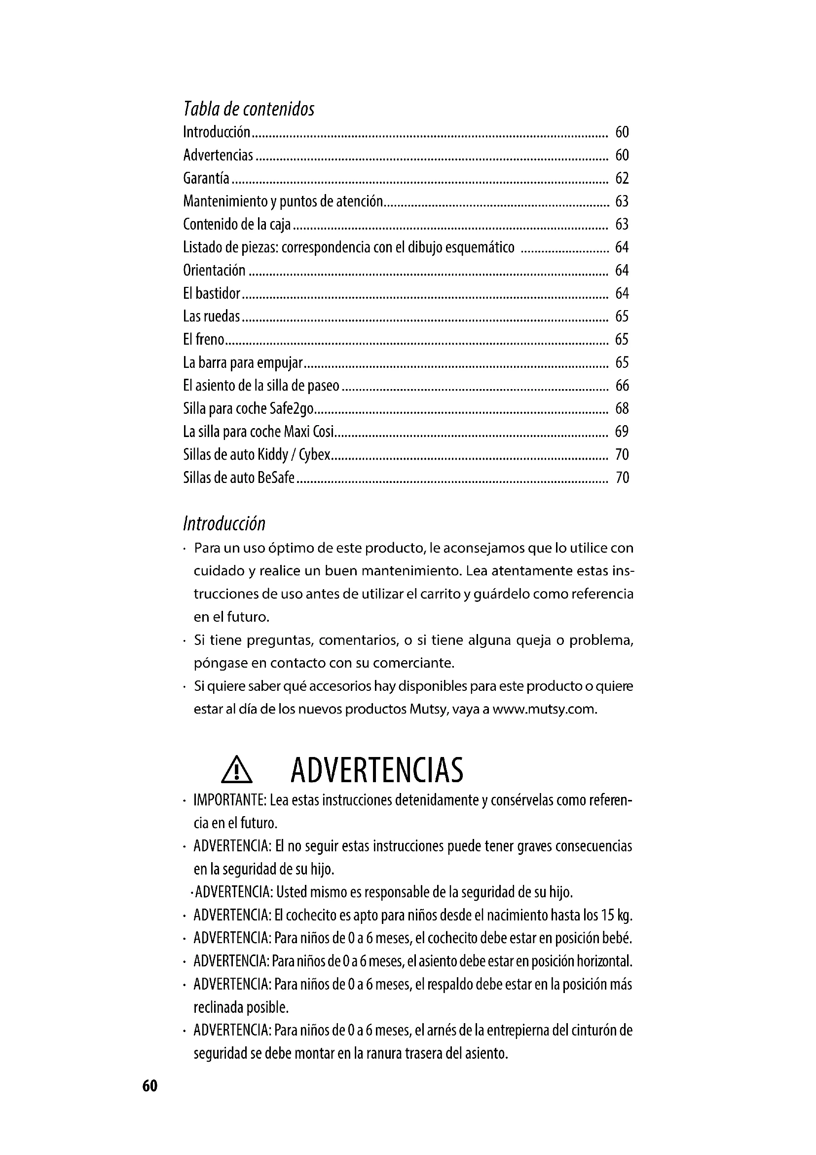 - ADVERTENCIA: Si se colocan;bolsas, accesos o también en el producto, que no se an losrecommended por el fabricante, poder hacer que el carrito sea inestable. Utilice exclusivamente accesos originales Mutsy.