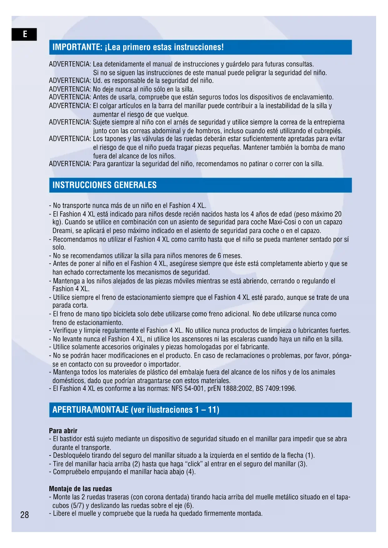 ACCESSOIRES Nacelle Dreami Housse de pluie/coupe-vent Chancelière L’utilisation des accessoires non d’origine peut être nuisible au bon fonctionnement de la Fashion 4 XL. QUESTIONS? Contactez votre vendeur ou importateur (voir l’adresse au dos). GARANTIE - La garantie est valable pour une période de 12 mois à partir de la date d’achat. Elle ne couvre que les défauts des matériaux et de fabrication. La facture d’origine constitue la seule preuve de la date d’achat. Les droits ouverts par la garantie ne sont pas transmissibles et seul le premier propriétaire peut en bénéficier. Cette garantie ne couvre que les produits n’ayant subi aucune modification de la part de leur propriétaire. - Dans le cas d’un défaut, le propriétaire doit retourner le produit à son fournisseur. Si celui-ci ne parvient pas à résoudre le problème, il devra alors retourner le produit au fabricant, accompagné d’une description précise de la réclamation et de la preuve d'achat datée. Le produit ne peut être remboursé ni échangé. Une réparation n’ouvre pas de droit à une extension de la période de garantie. - Le fabricant n’est en aucun cas responsable des dommages autres que ceux subis par les produits fabriqués par ses soins. La garantie ne s’applique pas si - Le produit n’est pas retourné au fabricant accompagné de la preuve d'achat validée. - Les défauts sont dus à une utilisation ou à un entretien impropres, c’est-à-dire non conformes aux instructions du mode d’emploi. - Le produit a subi une décoloration ou un dommage dus aux lavages ou à l’eau de pluie. - Le produit a fait l’objet d’une négligence ou, à la suite d’un choc, son tissu a subi des altérations ou son cadre a subi des dommages. - Le défaut est le résultat d’un accident ou d’un voyage en avion. - Le défaut est le résultat d’une surcharge (dépassement du poids maximum de l’enfant ou des articles transportés). - Le défaut est le résultat de l’usage d’une plate-forme pour un deuxième enfant. - Le produit présente des signes d’usure normale aux roues, pneus et/ou tissu, résultat d’un usage quotidien. - Le produit est entré en collision avec, par exemple, une bordure de trottoir ou une porte lourde. L’alignement des roues et/ou essieux sera faussé ou tordu, empêchant ainsi la poussette de rouler droit. - Les traces de pneus ont abîmé des surfaces telles que des planchers lamellés. - Les conditions de la garantie mentionnées ci-dessus n’ont pas été respectées.E IMPORTANTE: ¡Lea primero estas instrucciones! ADVERTENCIA: Lea detenidamente el manual de instrucciones y guárdelo para futuras consultas. Si no se siguen las instrucciones de este manual puede peligrar la seguridad del niño. ADVERTENCIA: Ud. es responsable de la seguridad del niño. ADVERTENCIA: No deje nunca al niño sólo en la silla. ADVERTENCIA: Antes de usarla, compruebe que están seguros todos los dispositivos de enclavamiento. ADVERTENCIA: El colgar artículos en la barra del manillar puede contribuir a la inestabilidad de la silla y aumentar el riesgo de que vuelque. ADVERTENCIA: Sujete siempre al niño con el arnés de seguridad y utilice siempre la correa de la entrepierna junto con las correas abdominal y de hombros, incluso cuando esté utilizando el cubrepiés. ADVERTENCIA: Los tapones y las válvulas de las ruedas deberán estar suficientemente apretadas para evitar el riesgo de que el niño pueda tragar piezas pequeñas. Mantener también la bomba de mano fuera del alcance de los niños. ADVERTENCIA: Para garantizar la seguridad del niño, recomendamos no patinar o correr con la silla. INSTRUCCIONES GENERALES - No transporte nunca más de un niño en el Fashion 4 XL. - El Fashion 4 XL está indicado para niños desde recién nacidos hasta los 4 años de edad (peso máximo 20 kg). Cuando se utilice en combinación con un asiento de seguridad para coche Maxi-Cosi o con un capazo Dreami, se aplicará el peso máximo indicado en el asiento de seguridad para coche o en el capazo. - Recomendamos no utilizar el Fashion 4 XL como carrito hasta que el niño se pueda mantener sentado por sí solo. - No se recomendamos utilizar la silla para niños menores de 6 meses. - Antes de poner al niño en el Fashion 4 XL, asegúrese siempre que éste está completamente abierto y que se han echado correctamente los mecanismos de seguridad. - Mantenga a los niños alejados de las piezas móviles mientras se está abriendo, cerrando o regulando el Fashion 4 XL. - Utilice siempre el freno de estacionamiento siempre que el Fashion 4 XL esté parado, aunque se trate de una parada corta. - El freno de mano tipo bicicleta solo debe utilizarse como freno adicional. No debe utilizarse nunca como freno de estacionamiento. - Verifique y limpie regularmente el Fashion 4 XL. No utilice nunca productos de limpieza o lubricantes fuertes. - No levante nunca el Fashion 4 XL, ni utilice los ascensores ni las escaleras cuando haya un niño en la silla. - Utilice solamente accesorios originales y piezas homologadas por el fabricante. - No se podrán hacer modificaciones en el producto. En caso de reclamaciones o problemas, por favor, pónga- se en contacto con su proveedor o importador. - Mantenga todos los materiales de plástico del embalaje fuera del alcance de los niños y de los animales domésticos, dado que podrían atragantarse con estos materiales. - El Fashion 4 XL es conforme a las normas: NFS 54-001, prEN 1888:2002, BS 7409:1996. APERTURA/MONTAJE (ver ilustraciones 1 – 11) Para abrir - El bastidor está sujeto mediante un dispositivo de seguridad situado en el manillar para impedir que se abra durante el transporte. - Desbloquéelo tirando del seguro del manillar situado a la izquierda en el sentido de la flecha (1). - Tire del manillar hacia arriba (2) hasta que haga “click” al entrar en el seguro del manillar (3). - Compruébelo empujando el manillar hacia abajo (4). Montaje de las rue