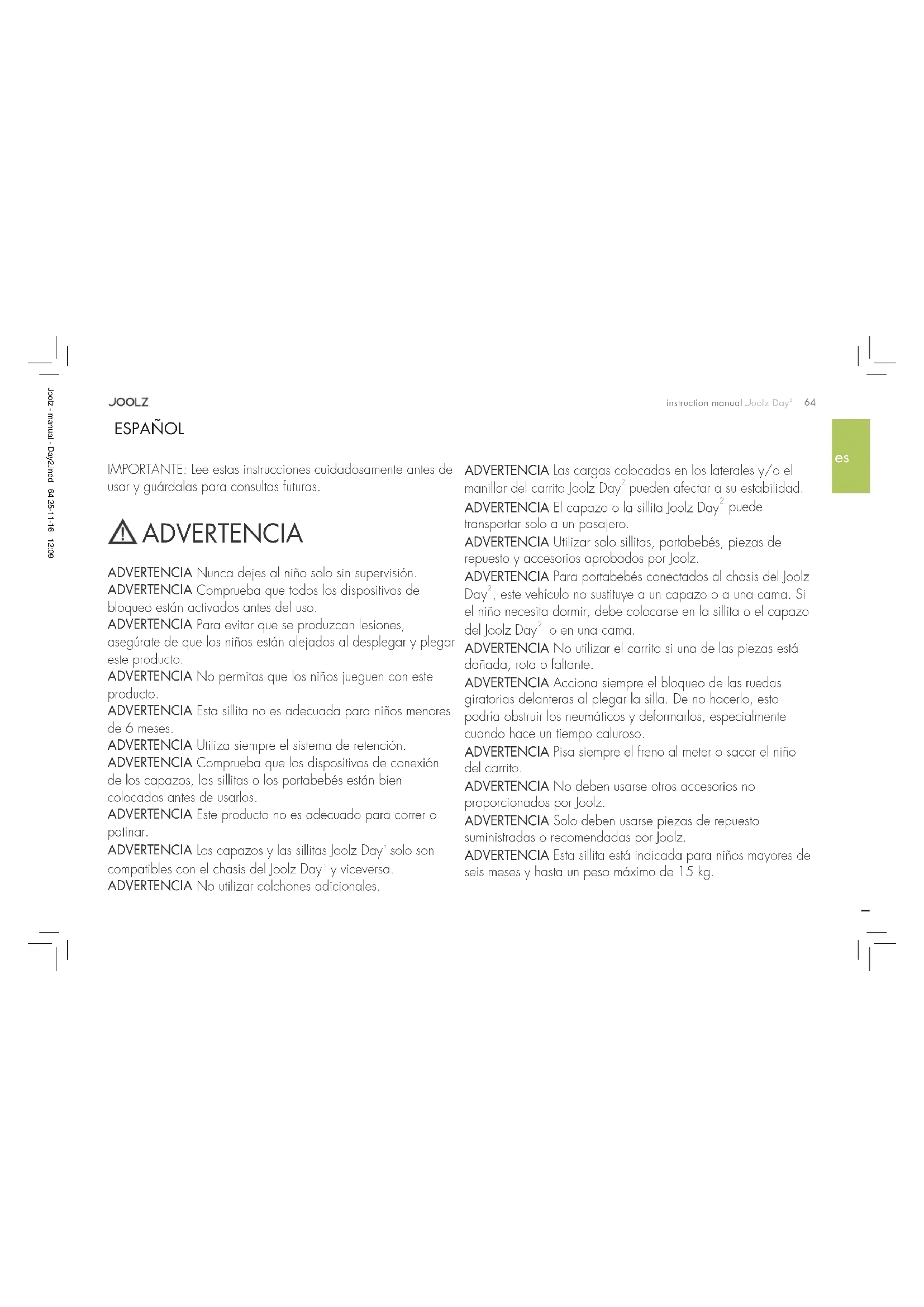 IMPORTANTE: Lee estas instrucciones cuidadosamente antes de usar y guárdalas para consultas futuras. ADVERTENCIA ADVERTENCIA Nunca dejes al niño solo sin supervisión. ADVERTENCIA Comprueba que todos los dispositivos de bloqueo están activados antes del uso. ADVERTENCIA Para evitar que se produzcan lesiones, asegúrate de que los niños están alejados al desplegar y plegar este producto. ADVERTENCIA No permitas que los niños jueguen con este producto. ADVERTENCIA Esta sillita no es adecuada para niños menores de 6 meses. ADVERTENCIA Utiliza siempre el sistema de retención. ADVERTENCIA Comprueba que los dispositivos de conexión de los capazos, las sillitas o los portabebés están bien colocados antes de usarlos. ADVERTENCIA Este producto no es adecuado para correr o patinar. ADVERTENCIA Los capazos y las sillitas Joolz Day