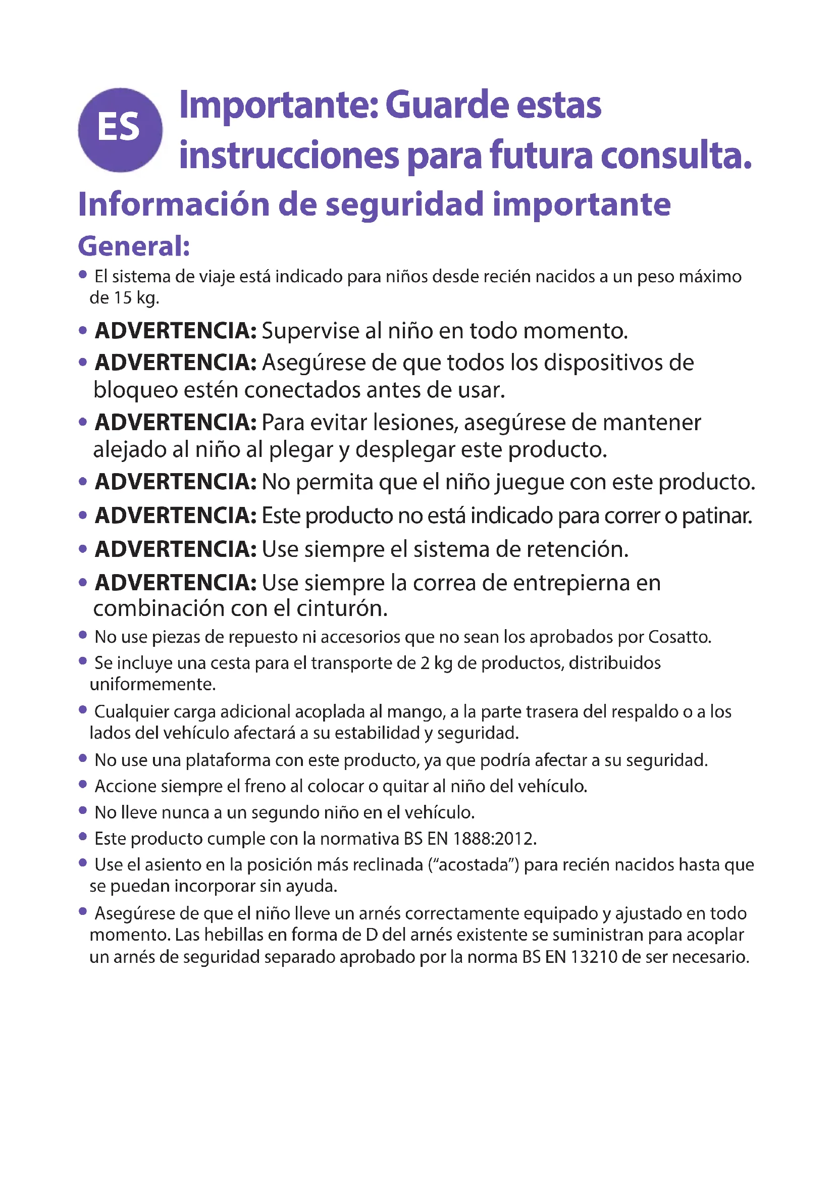 S10 S11 S12 S13 S14 S15 S16 S17 S18 Recambios: Disponemos de todos los recambios listados a continuación para su producto. Para los clientes del Reino Unido e Irlanda, por favor realicen sus pedidos a través de nuestros sitio Web: http://www.cosatto.com/service-centre/spares Para los clientes de fuera del Reino Unido e Irlanda, en http://www.cosatto.com/stockists encontrarán los datos de contacto de sus distribuidores locales. Si necesita asistencia adicional, por favor póngase en contacto con nosotros en cuddle@cosatto.comSu sistema de viaje se ha elaborado para satisfacer exhaustivos estándares de seguridad, y con un uso y mantenimiento correctos, ofrecerá un rendimiento excelente durante muchos años. El chasis es resistente, pero se verá afectado si la rueda trasera tropieza con escalones o aceras. Un impacto continuo causará daños. Si el niño lleva zapatos rígidos, pueden dañar el tejido suave. Guarde el sistema de viaje en un lugar seco y seguro. Guardar un sistema de viaje húmedo fomentará el crecimiento de moho, así que, tras exponerlo a condiciones húmedas, séquelo con un paño suave y déjelo secar completamente antes de guardarlo. No deje el sistema de viaje al sol durante períodos prolongados, ya que podrían decolorarse algunos tejidos. Inspeccione periódicamente los dispositivos de cierre, frenos, ruedas, conjunto de arnés, retenedores, ajustadores del asiento, juntas y accesorios para cerciorarse de que sean seguros y funcionen correctamente. Deberían poder moverse en todo momento. Los productos de Cosatto están concebidos para funcionar con un mínimo mantenimiento, no obstante, lubricar de forma periódica las piezas móviles ampliará la vida útil de su sistema de viaje y facilitará la abertura y el plegado. Si las piezas del sistema de viaje se vuelven rígidas o difíciles de manejar, aplique ligeramente un lubricante en aerosol, p. ej., silicona. No use aceite ni grasa. Las ruedas están sujetas a desgaste y deberían cambiarse de ser necesario. Debe realizarse un mantenimiento y reacondicionado del sistema de transporte antes de usarlo para un segundo niño o al transcurrir 18 meses, lo que suceda primero. La capota puede limpiarse frotando ligeramente con una esponja mojada en agua templada y un detergente suave. Consulte la etiqueta de limpieza de las piezas textiles para ver las instrucciones de limpieza. Las piezas de plástico y metal pueden limpiarse frotando con una esponja mojada en agua templada y un detergente suave. No use nunca limpiadores agresivos con base de amoníaco, lejía o disolventes. Cuidado y mantenimiento:Consulte los siguientes diagramas: Sillita
