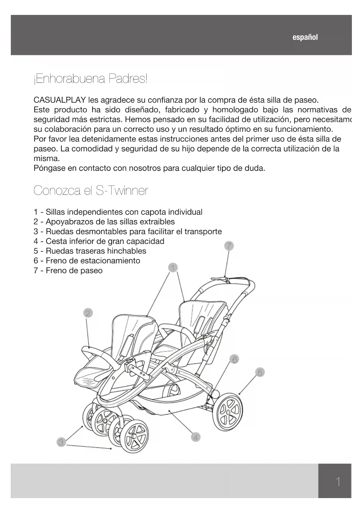 ¡Enhorabuena Padres! CASUALPLAY les agradece su conanza por la compra de ésta silla de paseo. Este producto ha sido diseñado, fabricado y homologado bajo las normativas de seguridad más estrictas. Hemos pensado en su facilidad de utilización, pero necesitamos su colaboración para un correcto uso y un resultado óptimo en su funcionamiento. Por favor lea detenidamente estas instrucciones antes del primer uso de ésta silla de paseo. La comodidad y seguridad de su hijo depende de la correcta utilización de la misma. Póngase en contacto con nosotros para cualquier tipo de duda. Conozca el S-Twinner