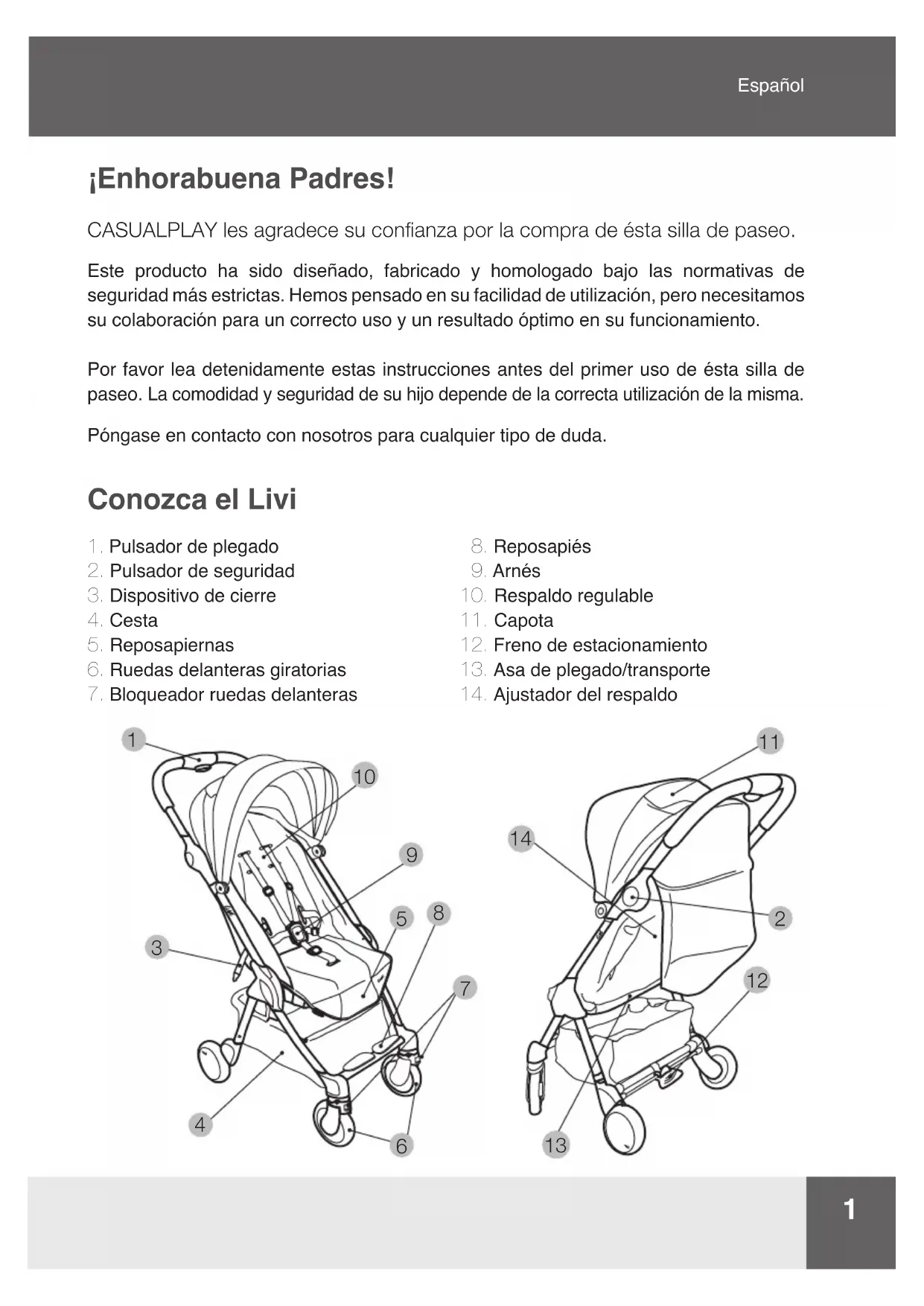 ¡Enhorabuena Padres! CASUALPLAY les agradece su conanza por la compra de ésta silla de paseo. Este producto ha sido diseñado, fabricado y homologado bajo las normativas de seguridad más estrictas. Hemos pensado en su facilidad de utilización, pero necesitamos su colaboración para un correcto uso y un resultado óptimo en su funcionamiento. Por favor lea detenidamente estas instrucciones antes del primer uso de ésta silla de paseo. La comodidad y seguridad de su hijo depende de la correcta utilización de la misma. Póngase en contacto con nosotros para cualquier tipo de duda. Conozca el Livi2 Importante - Guardar estas instrucciones para consultas futuras. Este vehículo es para niños desde 0 meses y hasta 15 kg. ADVERTENCIA: Nunca deje al niño desatendido. ADVERTENCIA: Asegúrese que todos los dispositivos de bloqueo están engranados antes del uso. ADVERTENCIA: Para evitar lesiones, asegúrese de que el niño se mantiene alejado durante el desplegado y el plegado de este producto. ADVERTENCIA: No permita que el niño juegue con este producto. ADVERTENCIA: Siempre use el sistema de retención. ADVERTENCIA: Comprobar que los dispositivos de sujeción del capazo, del asiento o de la silla de coche están correctamente engranados antes del uso. ADVERTENCIA: Este producto no es adecuado para correr o patinar.
