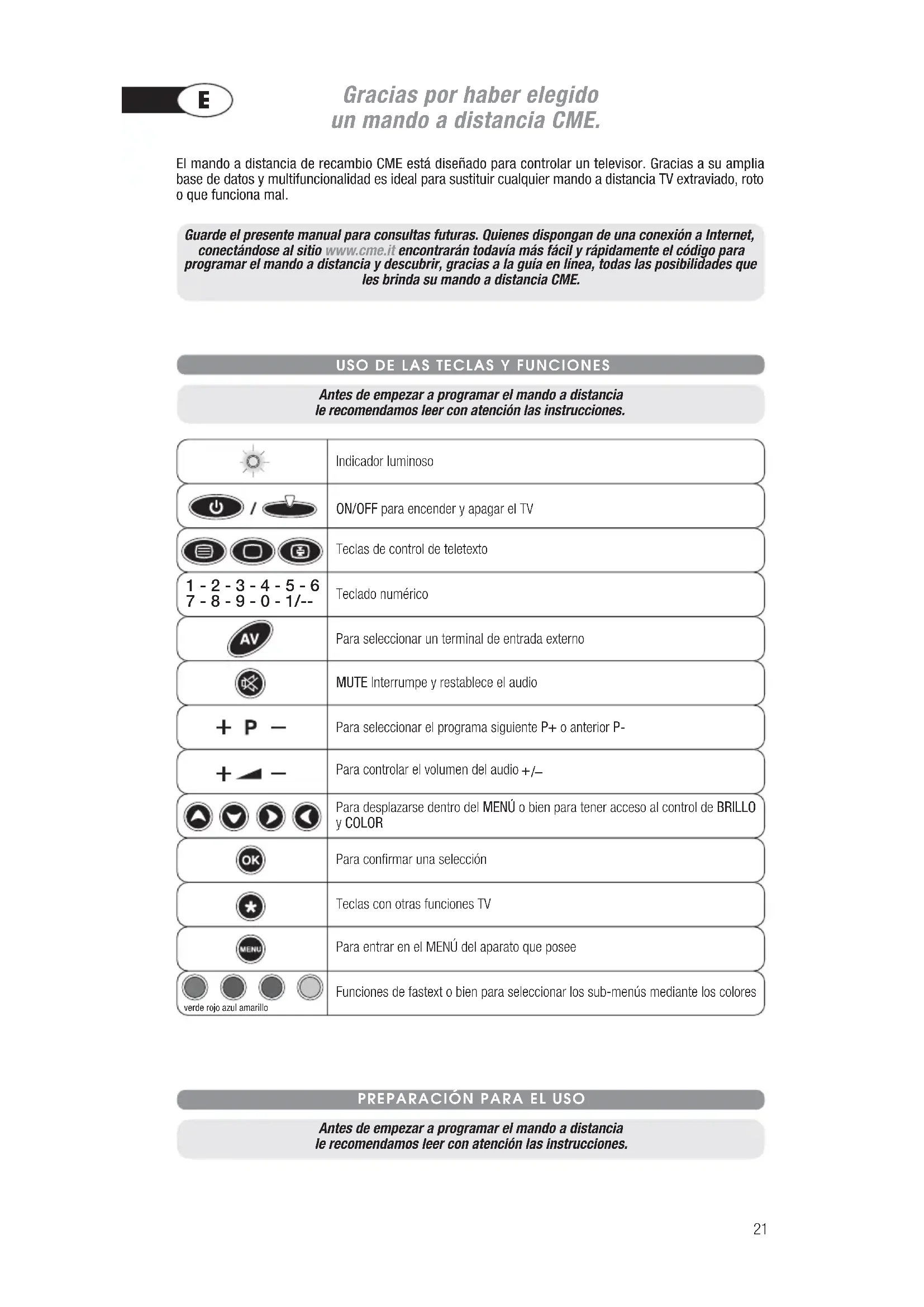 Para seleccionar el programa siguiente P+ o anterior P-MUTE Interrumpe y restablece el audioPara confirmar una selecciónFunciones de fastext o bien para seleccionar los sub-menús mediante los coloresPara entrar en el MENÚ del aparato que poseeTeclas con otras funciones TVPara seleccionar un terminal de entrada externoIndicador luminosoON/OFF para encender y apagar el TV Para desplazarse dentro del MENÚ o bien para tener acceso al control de BRILLO y COLORverde rojo azul amarilloUSO DE LAS TECLAS Y FUNCIONES Antes de empezar a programar el mando a distancia le recomendamos leer con atención las instrucciones. El mando a distancia de recambio CME está diseñado para controlar un televisor. Gracias a su ampliabase de datos y multifuncionalidad es ideal para sustituir cualquier mando a distancia TV extraviado, rotoo que funciona mal. Gracias por haber elegido un mando a distancia CME. Guarde el presente manual para consultas futuras. Quienes dispongan de una conexión a Internet, conectándose al sitio www.cme.it encontrarán todavía más fácil y rápidamente el código para programar el mando a distancia y descubrir, gracias a la guía en línea, todas las posibilidades que les brinda su mando a distancia CME.