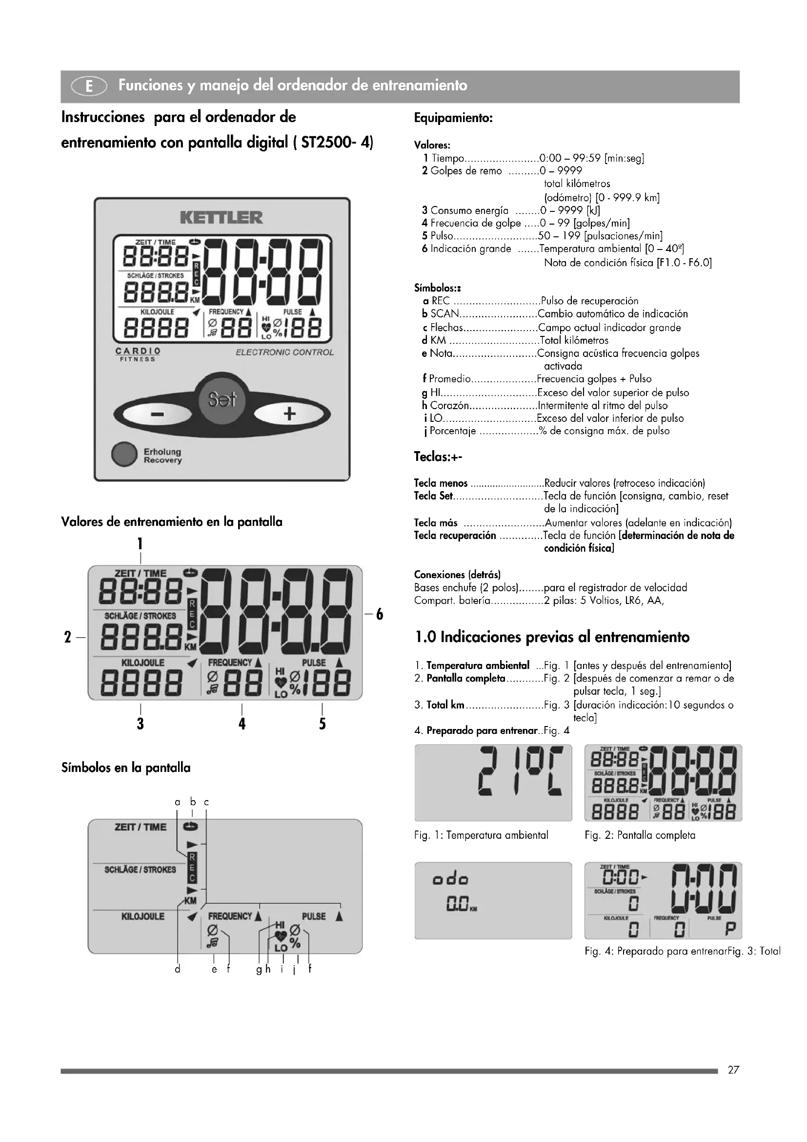 Instrucciones para el ordenador de entrenamiento con pantalla digital ( ST2500- 4) Equipamiento: Valores: 1 Tiempo........................0:00 – 99:59 [min:seg] 2 Golpes de remo ..........0 – 9999 total kilómetros (odómetro) [0 - 999.9 km] 3 Consumo energía ........0 – 9999 [kJ] 4 Frecuencia de golpe .....0 – 99 [golpes/min] 5 Pulso...........................50 – 199 [pulsaciones/min] 6 Indicación grande .......Temperatura ambiental [0 – 40º] Nota de condición física [F1.0 - F6.0] Símbolos:: a REC ............................Pulso de recuperación b SCAN.........................Cambio automático de indicación c Flechas........................Campo actual indicador grande d KM .............................Total kilómetros e Nota...........................Consigna acústica frecuencia golpes activada f Promedio.....................Frecuencia golpes + Pulso g HI...............................Exceso del valor superior de pulso h Corazón......................Intermitente al ritmo del pulso i LO..............................Exceso del valor inferior de pulso j Porcentaje ...................% de consigna máx. de pulso Teclas:+- Tecla menos ...........................Reducir valores (retroceso indicación) Tecla Set.............................Tecla de función [consigna, cambio, reset de la indicación] Tecla más ..........................Aumentar valores (adelante en indicación) Tecla recuperación ..............Tecla de función [determinación de nota de condición física] Conexiones (detrás) Bases enchufe (2 polos)........para el registrador de velocidad Compart. batería.................2 pilas: 5 Voltios, LR6, AA,