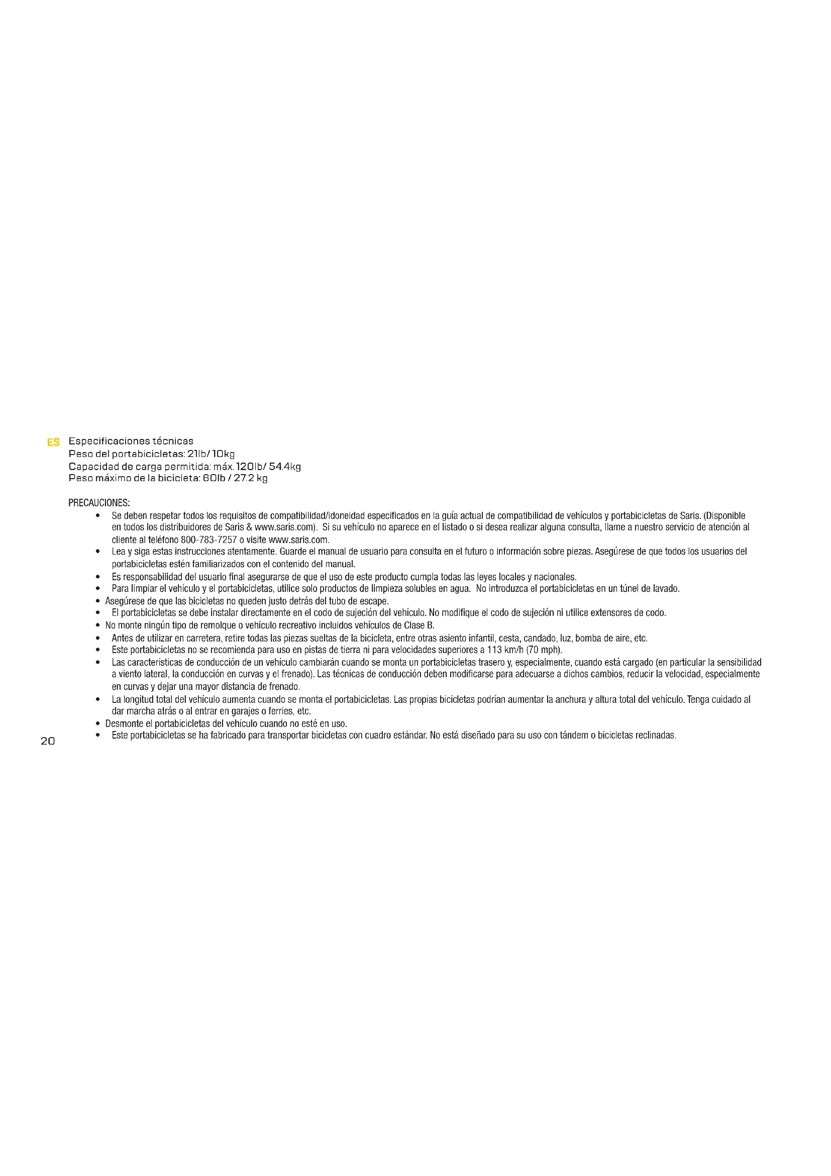 - Se deben respetar todos los requisitos de compatibilidad/idoneidad especificados en la guía actual de compatibilidad de vehículos y portabicicletas de Saris. (Disponible en todos los distribuidores de Saris & www.saris.com). Si su vehículo no aparece en el listado o si desea realizar alguna consulta, llame a nuestro servicio de atención al cliente al teléfono 800-783-7257 o visite www.saris.com.