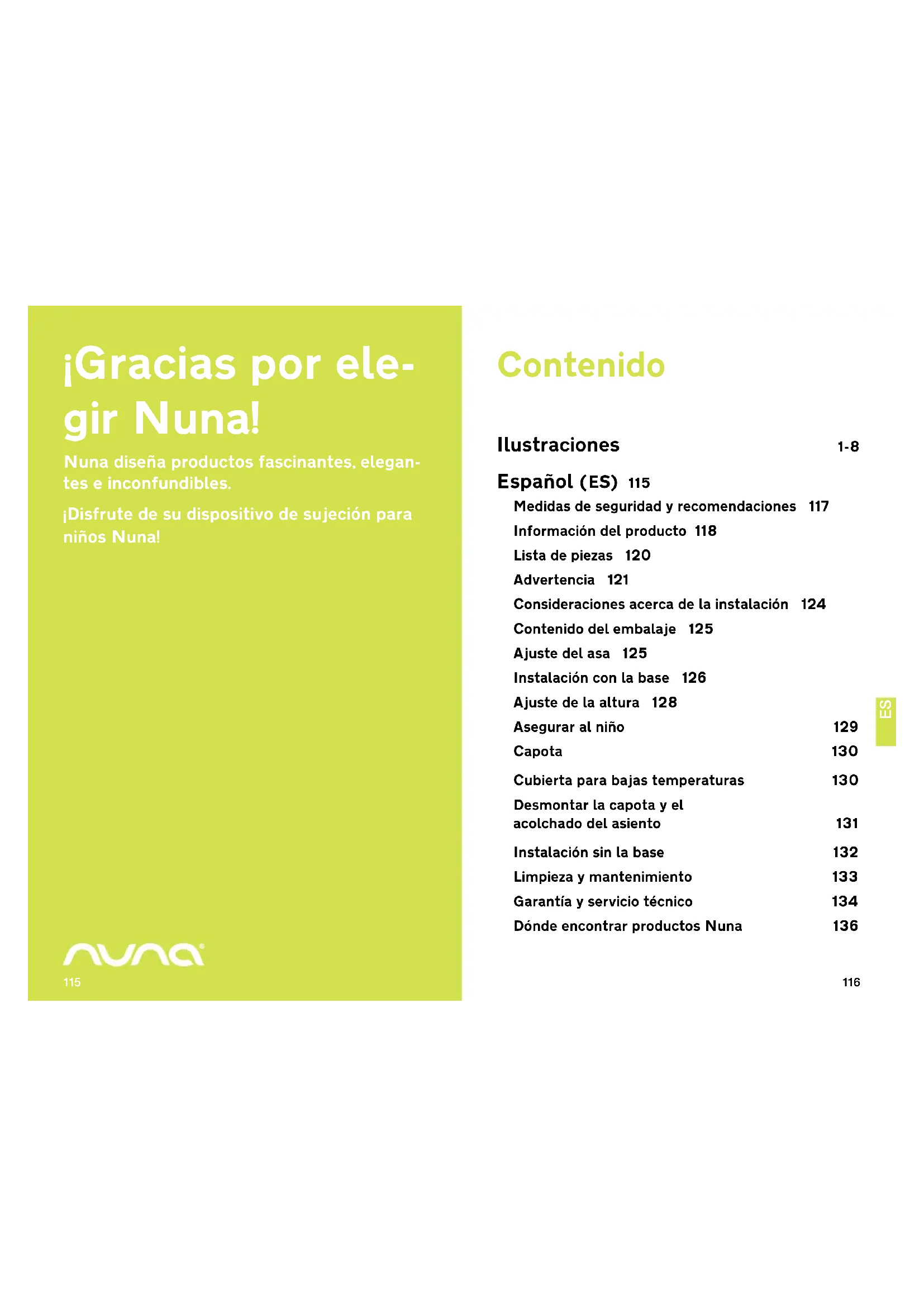 El dispositivo de sujeción para niños de Nuna, y su base, está cubiertos por una garantía de un año. Si este producto muestra alcún defecto durante el periodo de garantía,pongase en contacto con su proveedor. Si el proveedor no pueda.Ofrecerle asistencia,peará ponserse en contacto con un distribuidor local de Nuna.