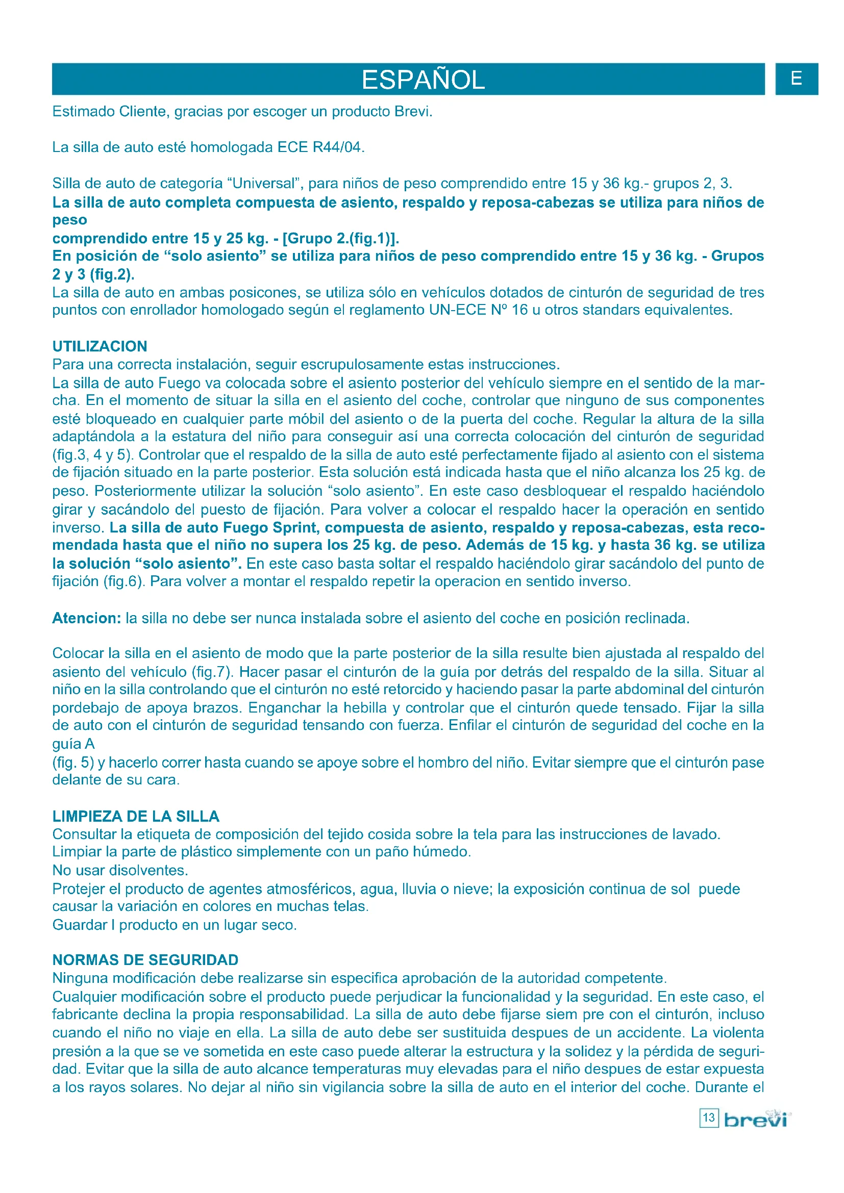 Ninguna modificación debe realizarse sin especifica aprobación de la autoridad competente. Cualquier modificación sobre el producto puede perjudicar la funcionalidad y la seguridad. En este caso, el fabricante declina la propia responsabilidad. La silla de auto debe fijarse siem pre con el cinturón, incluso cuando el niño no viaje en ella. La silla de auto debe ser sustituida despues de un accidente. La violenta presión a la que se ve sometida en este caso puede alterar la estructura y la solidez y la pérdida de seguri- dad. Evitar que la silla de auto alcance temperaturas muy elevadas para el niño despues de estar expuesta a los rayos solares. No dejar al niño sin vigilancia sobre la silla de auto en el interior del coche. Durante el E14 viaje, controlar periódicamente que tanto la silla de auto como el niño estén situados correctamente y el cinturón este bien tensado. Durante el viaje, evitar dejar objetos o equipaje en el habitáculo que puedan causar lesiones en caso de accidente. ADVERTENCIAS IMPORTANTES Seguir las instrucciones en el orden mostrado para conocer el Fuego Sprint antes de instalarlo en el ve- hículo. Puede ser peligroso no hacerlo. Conservar esta hoja de instrucciones en sitio seguro para futuras consultas. Asegurarse que Fuego Sprint no se dañe con el asiento abatible o con la puerta del coche. Asegurarse de regular el cinturón del coche para que se adapte al vestido del niño en cada viaje. Una fijación para vestidos de invierno, será demasiado larga para un niño que lleve vestidos de verano. Cubrir Fuego Sprint si se deja el coche al sol. El metal y las partes de plástico pueden quemar al tacto si se dejan al sol y la vestidura pue- de perder color. Asegurarse de llevar Fuego Brevi abrochado al asiento y respaldo a la vez, no colocándolo sólo con el respaldo y reposa-cabezas. Colocar Fuego Sprint en un lugar seguro cuando no se use. Evitar apoyar encima objetos pesados o ponerlo cerca de fuentes de calor como radiadores, etc.... La silla de auto debe ser igualmente bloqueada aunque no viaje el niño en ella. No usar Fuego Sprint sólo con el cinturón abdominal. No usar Fuego Sprint dado la vuelta hacia los asientos del coche. No usar objetos extraños para levantar Fuego Sprint del asiento, en caso de accidente los cinturones del coche no protegerían a vuestro niño como debieran. No intentar desmontar, modificar o añadir partes a la silla o cambiar el modo en el que los cinturones de vuestro coche estan hechos o usados. No dejar objetos en la parte de atrás del vehículo. En caso de frenada imprevista, los objetos libres moviéndose, podrían causar serias heridas. Los objetos largos y pesados son particularmente peligrosos. No dejar el asiento reclinable desbloqueado, en caso de frenada brusca, el respaldo podría herir al niño. No dejar a vuestro niño solo en el coche aunque sea por un periodo breve. No permitir al niño jugar o modificar Fuego Sprint. No transportar la silla de auto sin regular el cinturón de seguridad. No usar el respaldo del Fuego Sprint sin el asiento. Nunca quite al niño de la silla de auto mientras el vehículo se mueve. No quite etiquetas ,adhesivas o cosidas; ya que esto podría significar que el producto no corresponde más a las normas de seguridad.