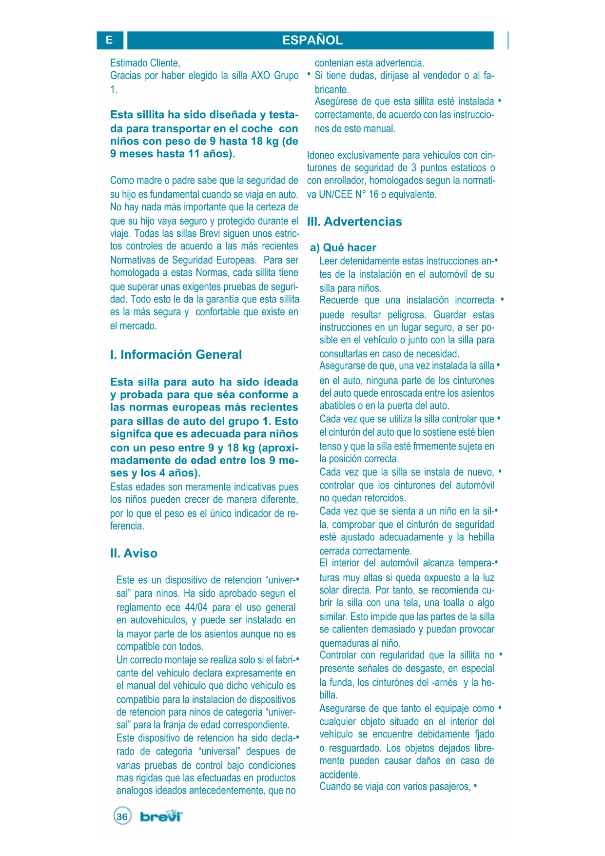 Esta sillita ha sido diseñada y testa- da para transportar en el coche con niños con peso de 9 hasta 18 kg (de 9 meses hasta 11 años). Como madre o padre sabe que la seguridad de su hijo es fundamental cuando se viaja en auto. No hay nada más importante que la certeza de que su hijo vaya seguro y protegido durante el viaje. Todas las sillas Brevi siguen unos estric- tos controles de acuerdo a las más recientes Normativas de Seguridad Europeas. Para ser homologada a estas Normas, cada sillita tiene que superar unas exigentes pruebas de seguri- dad. Todo esto le da la garantía que esta sillita es la más segura y confortable que existe en el mercado.