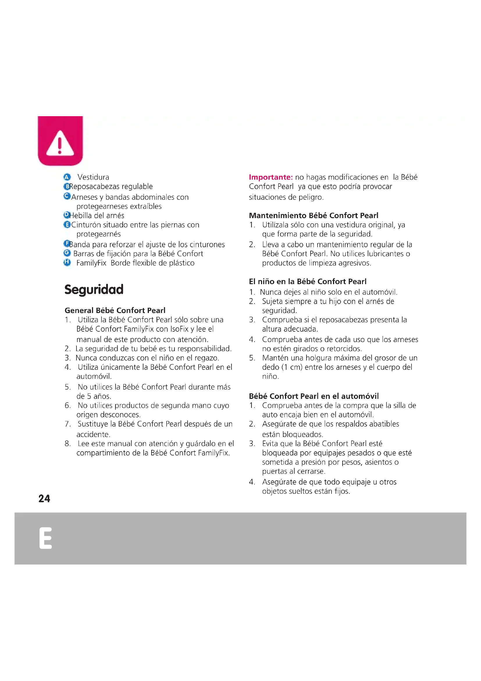 compartimiento de la Bébé Confort FamilyFix. Importante: no hagas modificaciones en la Bébé Confort Pearl ya que esto podría provocar situaciones de peligro. Mantenimiento Bébé Confort Pearl