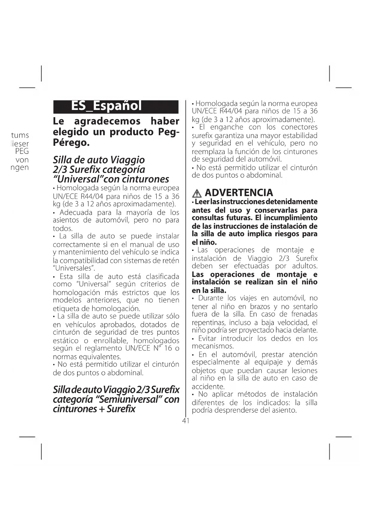 - No está permitido utilizar el cinturón de dos puntos o abdominal. Silla de auto Viaggio 2/3 Surefix categoría “Semiuniversal” con cinturones + Surefix ES_Español41 Tel. 0039/039/60.88.213 E-Mail assistenza@pegperego.it Webseite www.pegperego.com Alle Rechte geistigen Eigentums bezüglich der Inhalte dieser Bedienungsanleitung gehören PEG PEREGO S.p.A. und werden von den geltenden Bestimmungen geschützt. Le agradecemos haber elegido un producto Peg- Pérego. Silla de auto Viaggio 2/3 Surefix categoría “Universal”con cinturones