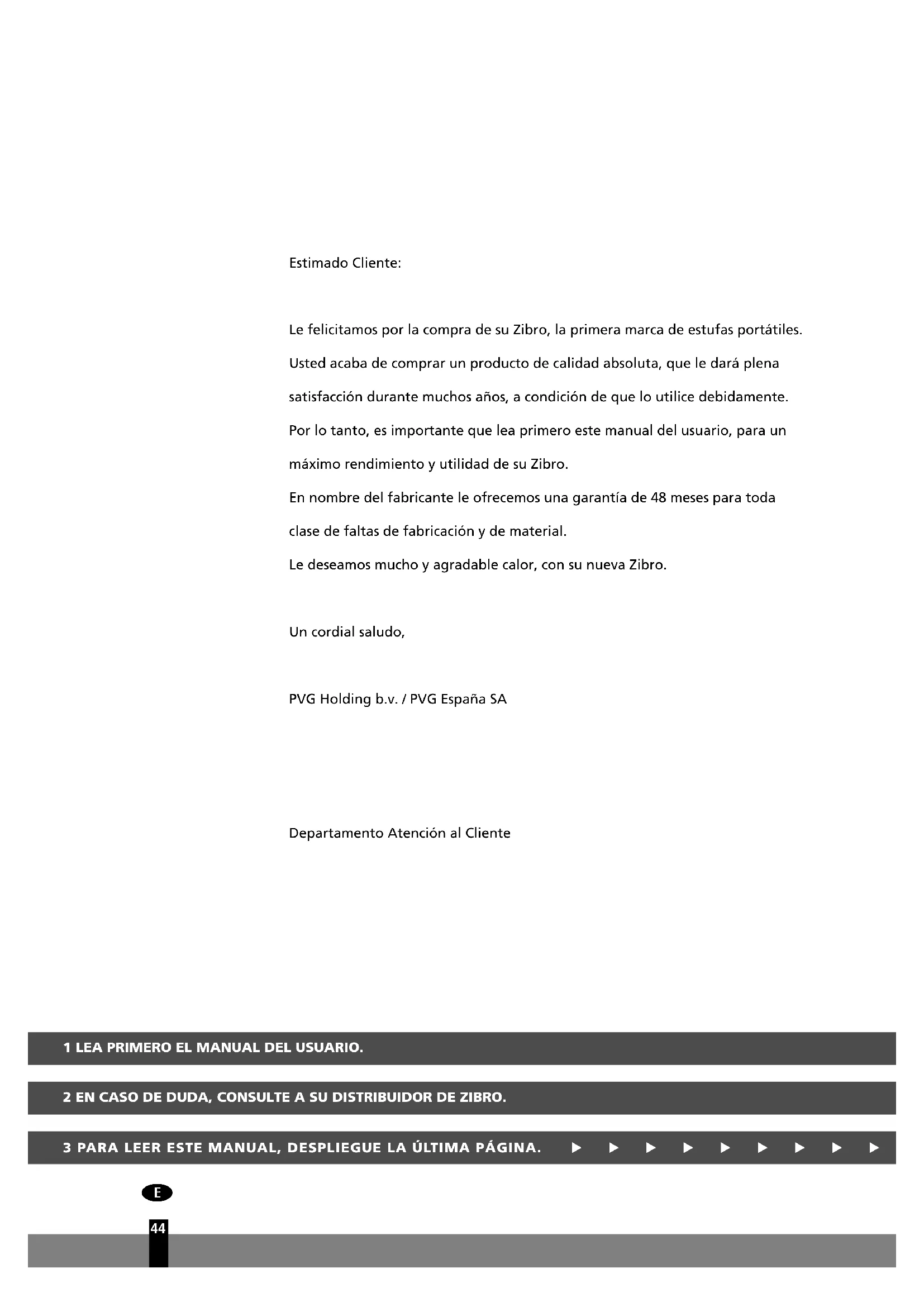 43Estimado Cliente: Le felicitamos por la compra de su Zibro, la primera marca de estufas portátiles. Usted acaba de comprar un producto de calidad absoluta, que le dará plena satisfacción durante muchos años, a condición de que lo utilice debidamente. Por lo tanto, es importante que lea primero este manual del usuario, para un máximo rendimiento y utilidad de su Zibro. En nombre del fabricante le ofrecemos una garantía de 48 meses para toda clase de faltas de fabricación y de material. Le deseamos mucho y agradable calor, con su nueva Zibro. Un cordial saludo, PVG Holding b.v. / PVG España SA Departamento Atención al Cliente 1 LEA PRIMERO EL MANUAL DEL USUARIO. 2 EN CASO DE DUDA, CONSULTE A SU DISTRIBUIDOR DE ZIBRO. 3 PARA LEER ESTE MANUAL, DESPLIEGUE LA ÚLTIMA PÁGINA.