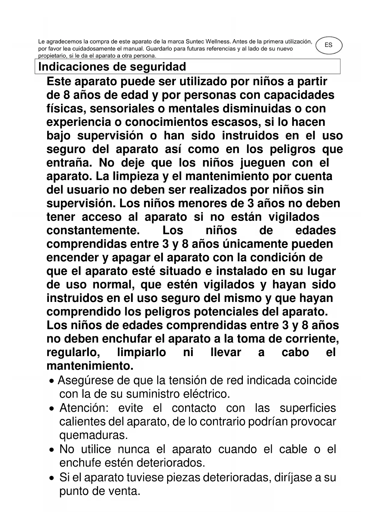 Heat Safe humid SUNTEC WELLNESS GMBH / HOLZSTRASSE 2 / 40221 DÜSSELDORF / GERMANYES Le agradecemos la compra de este aparato de la marca Suntec Wellness. Antes de la primera utilización, por favor lea cuidadosamente el manual. Guardarlo para futuras referencias y al lado de su nuevo propietario, si le da el aparato a otra persona. Indicaciones de seguridad Este aparato puede ser utilizado por niños a partir de 8 años de edad y por personas con capacidades físicas, sensoriales o mentales disminuidas o con experiencia o conocimientos escasos, si lo hacen bajo supervisión o han sido instruidos en el uso seguro del aparato así como en los peligros que entraña. No deje que los niños jueguen con el aparato. La limpieza y el mantenimiento por cuenta del usuario no deben ser realizados por niños sin supervisión. Los niños menores de 3 años no deben tener acceso al aparato si no están vigilados constantemente. Los niños de edades comprendidas entre 3 y 8 años únicamente pueden encender y apagar el aparato con la condición de que el aparato esté situado e instalado en su lugar de uso normal, que estén vigilados y hayan sido instruidos en el uso seguro del mismo y que hayan comprendido los peligros potenciales del aparato. Los niños de edades comprendidas entre 3 y 8 años no deben enchufar el aparato a la toma de corriente, regularlo, limpiarlo ni llevar a cabo el mantenimiento.