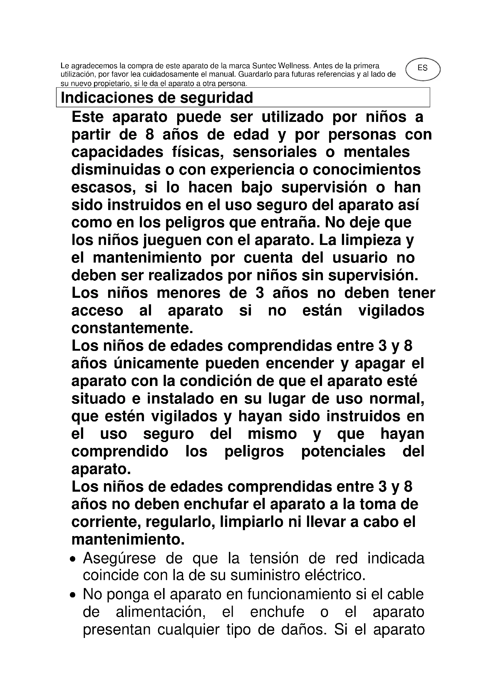 Heat Safe SUNTEC WELLNESS GMBH / HOLZSTRASSE 2 / 40221 DÜSSELDORF / GERMANYES Le agradecemos la compra de este aparato de la marca Suntec Wellness. Antes de la primera utilización, por favor lea cuidadosamente el manual. Guardarlo para futuras referencias y al lado de su nuevo propietario, si le da el aparato a otra persona. Indicaciones de seguridad Este aparato puede ser utilizado por niños a partir de 8 años de edad y por personas con capacidades físicas, sensoriales o mentales disminuidas o con experiencia o conocimientos escasos, si lo hacen bajo supervisión o han sido instruidos en el uso seguro del aparato así como en los peligros que entraña. No deje que los niños jueguen con el aparato. La limpieza y el mantenimiento por cuenta del usuario no deben ser realizados por niños sin supervisión. Los niños menores de 3 años no deben tener acceso al aparato si no están vigilados constantemente. Los niños de edades comprendidas entre 3 y 8 años únicamente pueden encender y apagar el aparato con la condición de que el aparato esté situado e instalado en su lugar de uso normal, que estén vigilados y hayan sido instruidos en el uso seguro del mismo y que hayan comprendido los peligros potenciales del aparato. Los niños de edades comprendidas entre 3 y 8 años no deben enchufar el aparato a la toma de corriente, regularlo, limpiarlo ni llevar a cabo el mantenimiento.