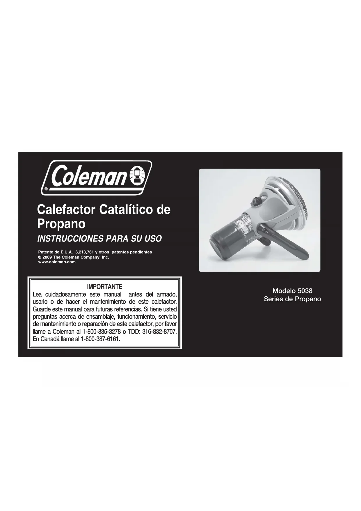 Modelo 5038 Series de Propano Patente de E.U.A. 6,213,761 y otros patentes pendientes © 2009 The Coleman Company, Inc. www.coleman.com IMPORTANTE Lea cuidadosamente este manual antes del armado, usarlo o de hacer el mantenimiento de este calefactor. Guarde este manual para futuras referencias. Si tiene usted preguntas acerca de ensamblaje, funcionamiento, servicio de mantenimiento o reparación de este calefactor, por favor llame a Coleman al 1-800-835-3278 o TDD: 316-832-8707. En Canadá llame al 1-800-387-6161.18 Contenido Información General de SeguridadPara ArmarPara EncenderPara ApagarPara AlmacenarCosas Que Usted Debe SaberLista de Piezas de ReemplazoGarantía Las precauciones de seguridad son esenciales cuando cualquier equipo mecánico o que requiere combustible de propano esté envuelto. Estas precauciones son necesarias para el uso, almacenamiento o compostura. Si usa este producto con el respeto y cuidado aquí demandado podrá reducir las posibilidades de lesiones a la persona o daño a la propiedad. Los siguientes símbolos mostrados se usan extensamente a lo largo de este manual. Siempre preste atención a estas precauciones, ya que son esenciales con el uso de cualquier equipo mecánico o que requiere combustible. Información General de Seguridad PELIGRO