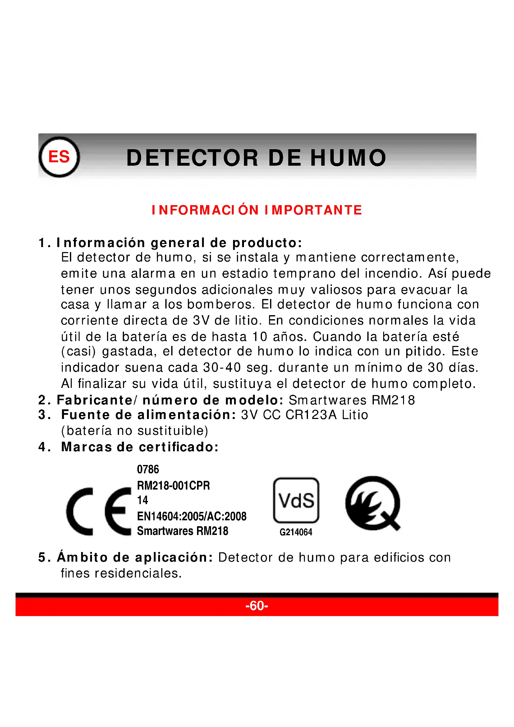 Si estas acciones no solucionan el problema, no intente repararlo usted mismo. Si el problema se produce en el periodo de garantía y está en condiciones de garantía, devuelva el detector de humo junto con una prueba de compra válida con una descripción detallada del problema a: ESPECIFICACIONES Alimentación : 3V CC CR123A Litio (batería no sustituible) Temperatura de funcionamiento : 4 ~ 38°C Humedad de funcionamiento : 25 ~ 85% Sensor de humo : Óptico Volumen de alarma : > 85dB(a) a 3 metros. Tiempo de pausa : aprox. 10 minutos : Exclusivamente para uso en interiores. : Lea el manual antes del uso, y consérvelo en un lugar seguro para usarlo en el futuro y para el mantenimiento del producto.-69- Este producto tiene una garantía de fábrica acorde con la normativa de la UE. La garantía dura los años indicados en el embalaje, a partir de la fecha de compra. Conserve el recibo – es necesaria la prueba de compra para ejercer la garantía. En caso de problemas, contacte con el comercio en el que adquirió el producto. Para obtener más información del producto visite nuestro sitio web: www.smartwares.eu. En esta dirección también podrá registrar el producto.