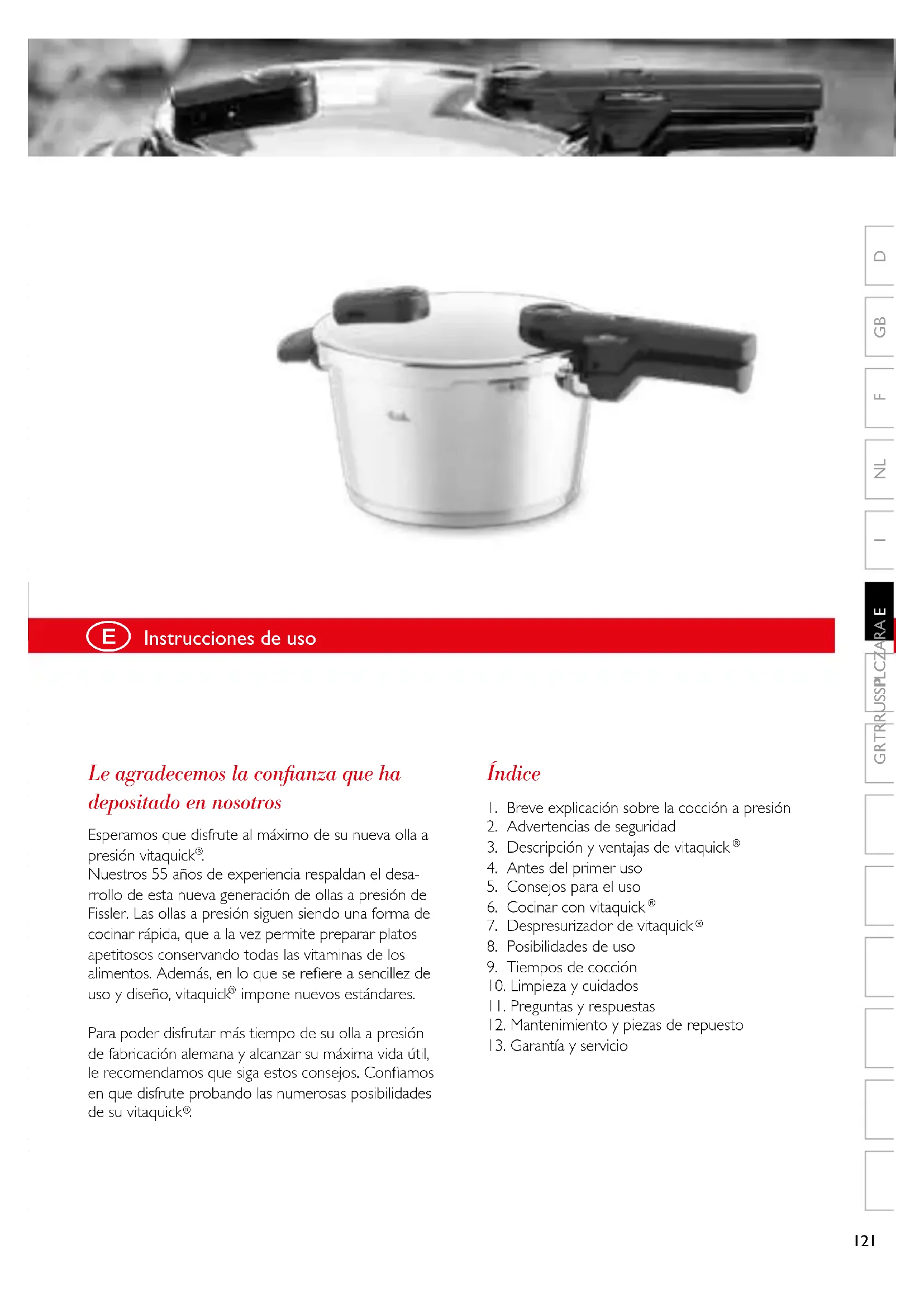 Nuestros 55 años de experiencia respaldan el descarnlo de esta nuevo generation de ollas a presión de Fissler. Las ollas a presión siguen siendo una forma de cocinar rápida, que a la vez permitte preparar platos apetitosos conservando todas las vitaminas de los alimentos. Además, en lo que se refiere a sencillez de uso y Diseño, vitaquick® impone新模式 estandares.