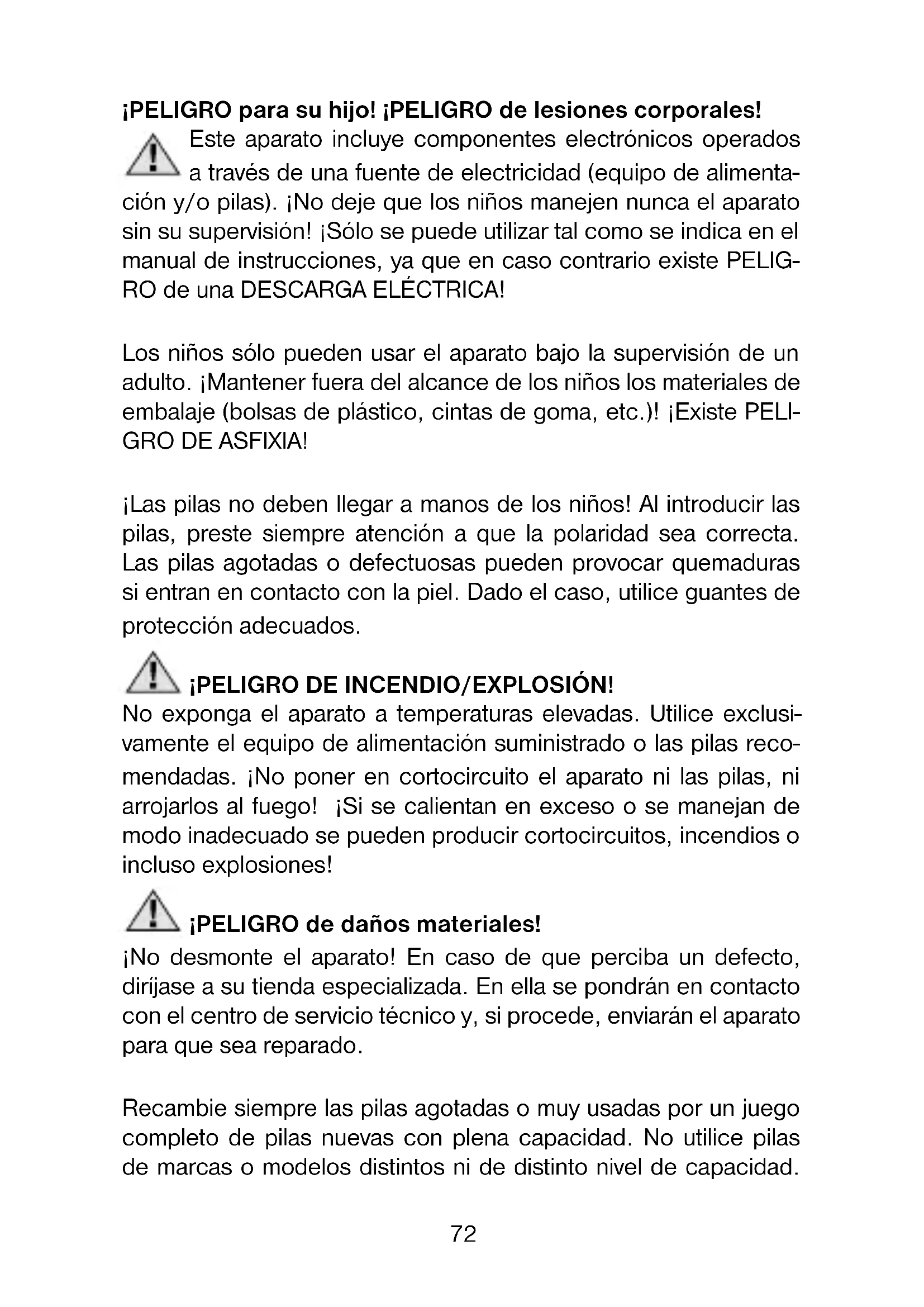 Prodotto: TempTrend Per la presente Bresser GmbH, afferma che questa unità (Stazione meteo / Art.No.: 70-04000), è coerente e conforme ai requisiti essenziali ed alle altre disposizioni pertinenti della direttiva 1999/5/EG. Bresser GmbH ha redatto una "dichiarazione di conformità" in linea con le disposizioni applicabili e le rispettive norme. Su richiesta, è visionabile in qualsiasi momento.71 IT/CH Garanzia e assistenza La durata regolare della garanzia è di 2 anni e decorre dalla data dell‘acquisto. Per godere di un‘estensione volontaria della garanzia come descritto sulla confe- zione regalo, è necessario registrarsi nel nostro sito Web. Le condizioni complete di garanzia e le informazioni sull‘estensione di garanzia e i servizi di assistenza sono visibili al sito www.bresser.de/warranty_terms. Desidera ricevere informazioni esaustive su questo pro- dotto in una lingua specifi ca? Venga a visitare il nostro sito Web al seguente link (codice QR Code) per conos- cere le versioni disponibili. www.bresser.de/download/700400X72 ¡PELIGRO para su hijo! ¡PELIGRO de lesiones corporales! Este aparato incluye componentes electrónicos operados a través de una fuente de electricidad (equipo de alimenta- ción y/o pilas). ¡No deje que los niños manejen nunca el aparato sin su supervisión! ¡Sólo se puede utilizar tal como se indica en el manual de instrucciones, ya que en caso contrario existe PELIG- RO de una DESCARGA ELÉCTRICA! Los niños sólo pueden usar el aparato bajo la supervisión de un adulto. ¡Mantener fuera del alcance de los niños los materiales de embalaje (bolsas de plástico, cintas de goma, etc.)! ¡Existe PELI- GRO DE ASFIXIA! ¡Las pilas no deben llegar a manos de los niños! Al introducir las pilas, preste siempre atención a que la polaridad sea correcta. Las pilas agotadas o defectuosas pueden provocar quemaduras si entran en contacto con la piel. Dado el caso, utilice guantes de protección adecuados. ¡PELIGRO DE INCENDIO/EXPLOSIÓN! No exponga el aparato a temperaturas elevadas. Utilice exclusi- vamente el equipo de alimentación suministrado o las pilas reco- mendadas. ¡No poner en cortocircuito el aparato ni las pilas, ni arrojarlos al fuego! ¡Si se calientan en exceso o se manejan de modo inadecuado se pueden producir cortocircuitos, incendios o incluso explosiones! ¡PELIGRO de daños materiales! ¡No desmonte el aparato! En caso de que perciba un defecto, diríjase a su tienda especializada. En ella se pondrán en contacto con el centro de servicio técnico y, si procede, enviarán el aparato para que sea reparado. Recambie siempre las pilas agotadas o muy usadas por un juego completo de pilas nuevas con plena capacidad. No utilice pilas de marcas o modelos distintos ni de distinto nivel de capacidad.73 ¡Hay que retirar las pilas del aparato si no se va a usar durante un período prolongado! INDICACIONES sobre la limpieza Antes de limpiarlo, retire el aparato de la fuente de alimentación eléctrica (extraer el equipo de alimentación o retirar las pilas). Limpie el aparato con un paño seco y sólo por la parte exterior. No utilice ningún agente limpiador líquido, a fi n de evitar daños en el sistema electrónico. ELIMINACIÓN Elimine los materiales de embalaje separándolos según su clase. Puede obtener información sobre la eliminación reglamentaria de desechos en su proveedor de servicios de eliminación de desechos municipal o bien en su ofi cina de medio ambiente. ¡No deposite aparatos eléctricos en la basura doméstica! Con arreglo a la Directiva Europea 2002/96/CE sobre aparatos eléctricos y electrónicos usados y a su aplicación en las respectivas legislaciones nacionales, los aparatos eléctricos usados deben recopilarse por separado y de- stinarse a un reciclaje adecuado desde el punto de vista medioambiental. De acuerdo con la normativa en materia de pilas y baterías recar- gables, está explicitamente prohibido depositarlas en la basura normal. Por favor, preste atención a lo que la normativa obliga cuan- do usted quiera deshacerse de estos productos - sobre puntos de recogida municipal o en el mercado minorista (disposición sobre violación de la Directiva en materia de los residuos domésticos- pilas y baterías-). A D ? 1 pila que contiene cadmio 2 pila que contiene mercurio 3 pila que contiene plomo ES74