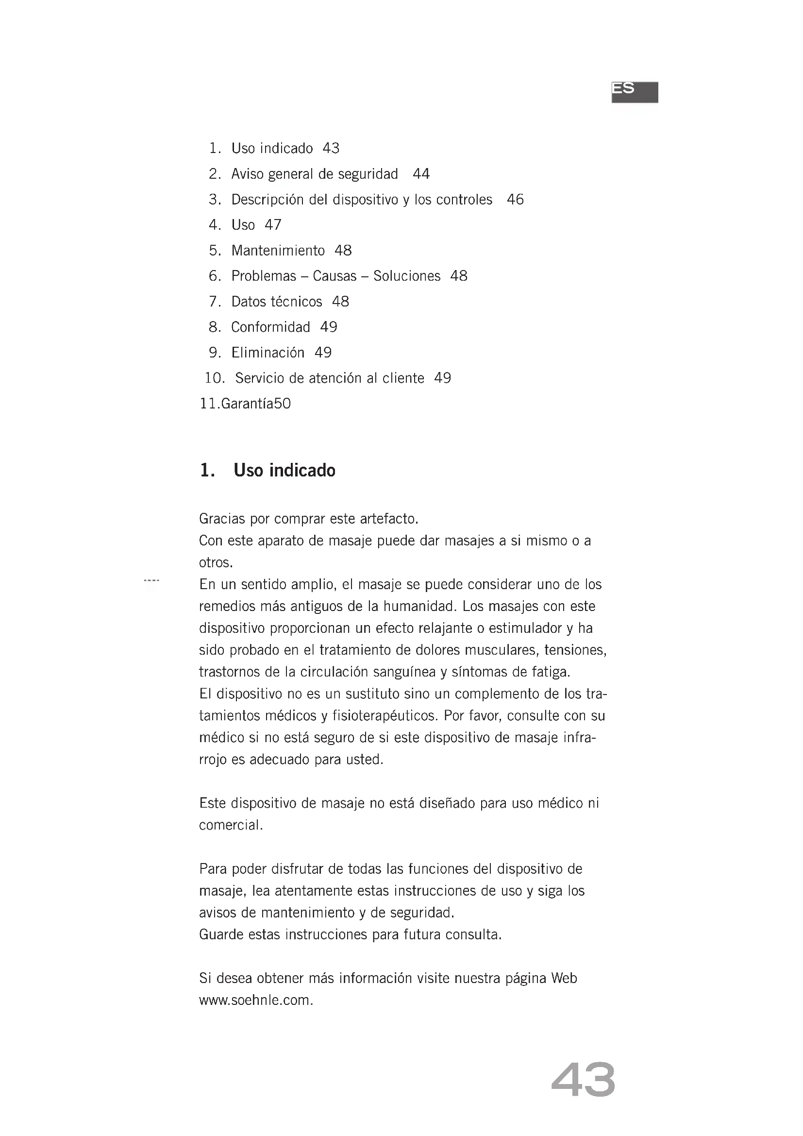 Gracias por comprar este artefacto. Con este aparato de masaje puede dar masajes a si mismo o a otros. En un sentido amplio, el masaje se puede considerar uno de los remedios más antiguos de la humanidad. Los masajes con este dispositivo proporcionan un efecto relajante o estimulador y ha sido probado en el tratamiento de dolores musculares, tensiones, trastornos de la circulación sanguínea y síntomas de fatiga. El dispositivo no es un sustituto sino un complemento de los tra- tamientos médicos y fisioterapéuticos. Por favor, consulte con su médico si no está seguro de si este dispositivo de masaje infra- rrojo es adecuado para usted. Este dispositivo de masaje no está diseñado para uso médico ni comercial. Para poder disfrutar de todas las funciones del dispositivo de masaje, lea atentamente estas instrucciones de uso y siga los avisos de mantenimiento y de seguridad. Guarde estas instrucciones para futura consulta. Si desea obtener más información visite nuestra página Web www.soehnle.com.44