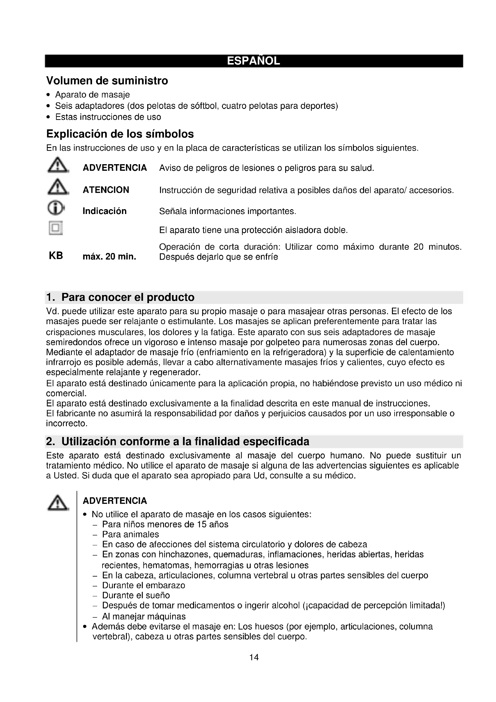 Este aparato está destinado exclusivamente al masaje del cuerpo humano. No puede sustituir un tratamiento médico. No utilice el aparato de masaje si alguna de las advertencias siguientes es aplicable a Usted. Si duda que el aparato sea apropiado para Ud, consulte a su médico.