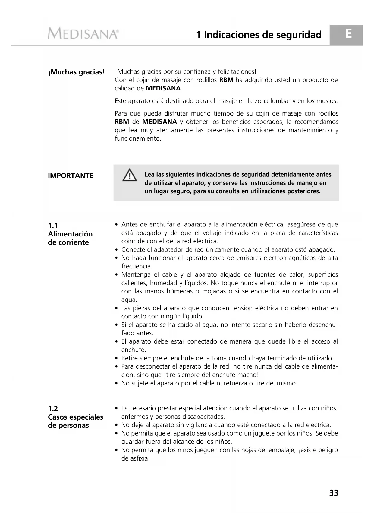 Para que pueda disfrutar mucho tiempo de su cojín de masaje con rodillos RBM de MEDISANA y obtener los beneficios esperados, le recomendamos que lea muy atentamente las presentes instrucciones de mantenimiento y funcionamiento.