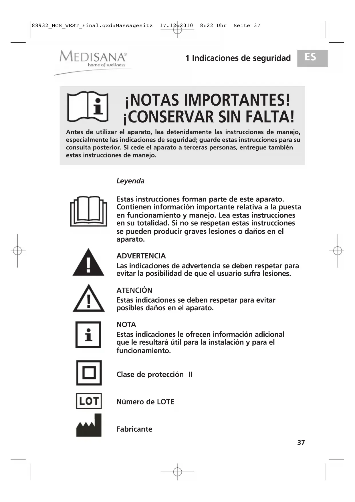 Para que pueda disfrutar mucho tiempo de su respaldo de masaje de Shiatsu MCS de MEDISANA y obtener los beneficios esperados, le recomendamos que lea muy atentamente las presentes instrucciones de mantenimiento y funcionamiento.