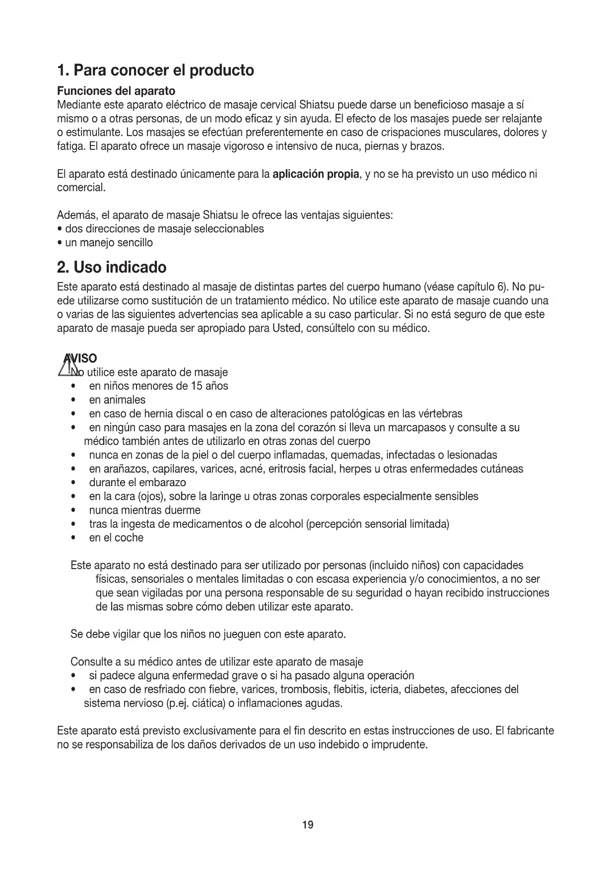 Esteaparatoestádestinadoalmasajededistintaspartesdelcuerpohumano(véasecapítulo6).Nopu- edeutilizarsecomosustitucióndeuntratamientomédico.Noutiliceesteaparatodemasajecuandouna ovariasdelassiguientesadvertenciasseaaplicableasucasoparticular.Sinoestásegurodequeeste aparatodemasajepuedaserapropiadoparaUsted,consúlteloconsumédico. AVISO Noutiliceesteaparatodemasaje