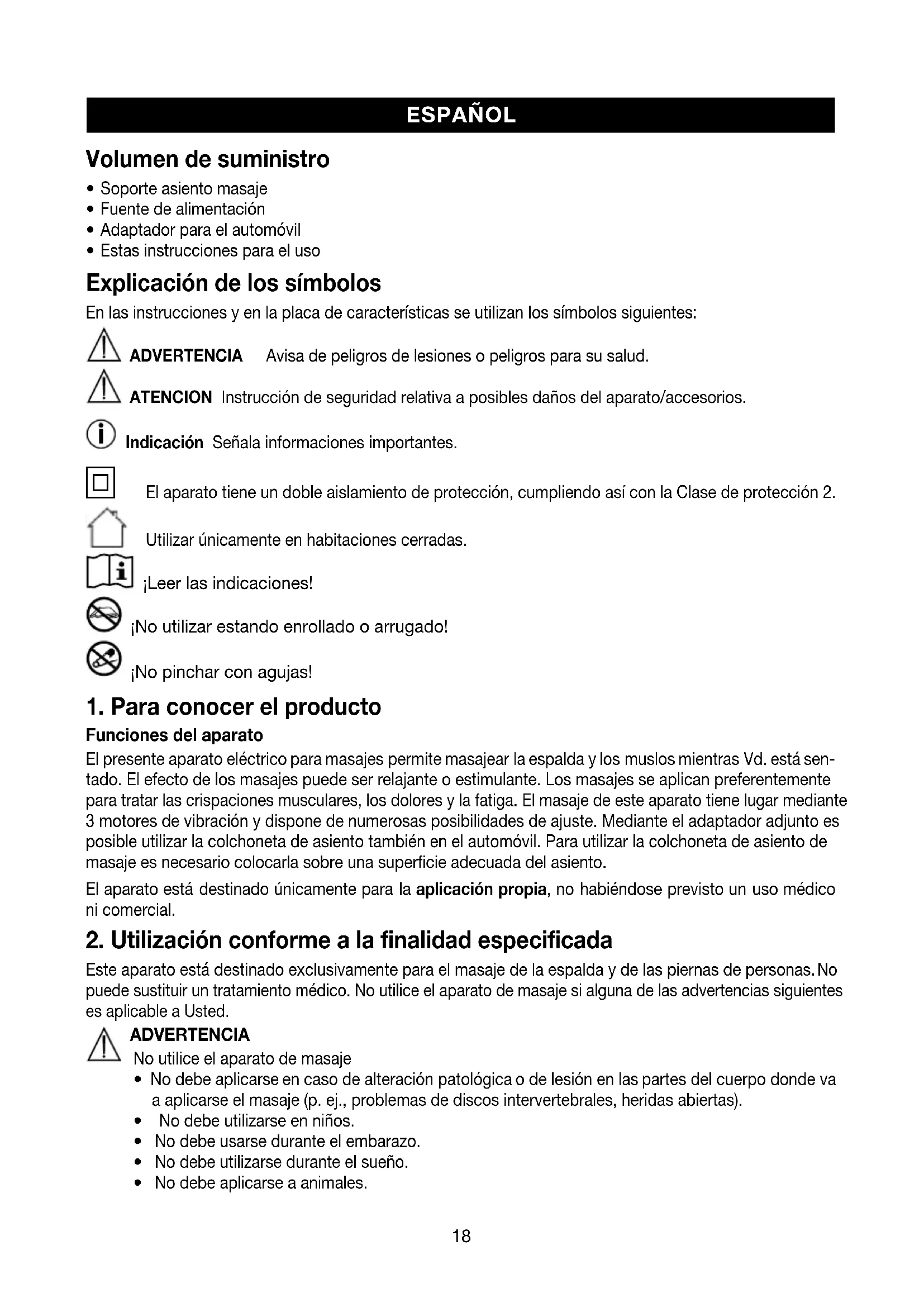 Funciones del aparato ElpresenteaparatoeléctricoparamasajespermitemasajearlaespaldaylosmuslosmientrasVd.estásen- tado. El efecto de los masajes puede ser relajante o estimulante. Los masajes se aplican preferentemente para tratar las crispaciones musculares, los dolores y la fatiga. El masaje de este aparato tiene lugar mediante 3 motores de vibración y dispone de numerosas posibilidades de ajuste. Mediante el adaptador adjunto es posibleutilizarlacolchonetadeasientotambiénenelautomóvil.Parautilizarlacolchonetadeasientode masaje es necesario colocarla sobre una superficie adecuada del asiento. Elaparatoestádestinadoúnicamenteparalaaplicación propia,nohabiéndoseprevistounusomédico ni comercial.