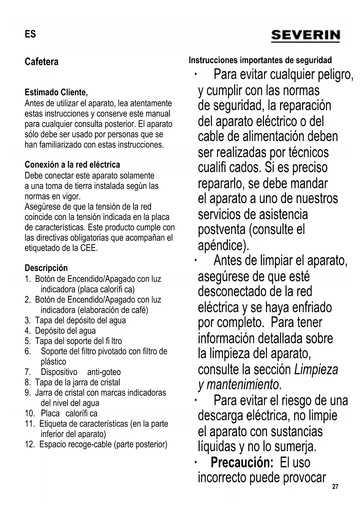 Instrucciones importantes de seguridad ∙ Para evitar cualquier peligro, y cumplir con las normas de seguridad, la reparación del aparato eléctrico o del cable de alimentación deben ser realizadas por técnicos cualifi cados. Si es preciso repararlo, se debe mandar el aparato a uno de nuestros servicios de asistencia postventa (consulte el apéndice). ∙ Antes de limpiar el aparato, asegúrese de que esté desconectado de la red eléctrica y se haya enfriado por completo. Para tener información detallada sobre la limpieza del aparato, consulte la sección Limpieza y mantenimiento. ∙ Para evitar el riesgo de una descarga eléctrica, no limpie el aparato con sustancias líquidas y no lo sumerja. ∙ Precaución: El uso incorrecto puede provocar ES28 lesiones personales graves. ∙ Precaución: Las superfi cies accesibles se calientan durante el funcionamiento del aparato y se mantendrán calientes durante cierto tiempo después. ∙ Este aparato ha sido diseñado para el uso doméstico u otra aplicación similar, por ejemplo - en cocinas de personal, en ofi cinas y otros puntos comerciales, - en empresas agrícolas, - por los clientes de hoteles, pensiones, etc. y alojamientos similares, - en casas rurales. ∙ Este aparato podrá ser utilizado por niños (mayores de 8 años) y personas con reducidas facultades físicas, sensoriales o mentales, o sin experiencia ni conocimiento del producto, siempre que hayan recibido la supervisión o instrucciones referentes al uso del aparato y entiendan por completo el peligro y las precauciones de seguridad. ∙ Los niños no deben jugar con el aparato. ∙ No se debe permitir que los niños realicen ningún trabajo de limpieza o mantenimiento del aparato a menos que esté bajo vigilancia y tengan más de 8 años. ∙ El aparato y su cable eléctrico siempre se deben mantener fuera del alcance de niños menores de 8 años. ∙ Precaución: mantenga a los niños alejados del material de embalaje, porque podría ser peligroso, existe el peligro de asfi xia. ∙ Antes de utilizar el aparato, siempre se debe comprobar que tanto la unidad principal, el cable de alimentación como cualquier accesorio no están defectuosos. En caso de que el aparato haya caído sobre una superfi cie dura, o se haya tirado en exceso del cable de alimentación, no se deberá utilizar de nuevo: incluso los desperfectos no29 visibles pueden tener efectos adversos sobre la seguridad en el uso del aparato. ∙ Antes de su utilización, asegúrese de que el asa de la jarra de cristal está correctamente ajustada y no se corre ningún peligro. ∙ Durante su operación, la cafetera deberá hallarse en una superfi cie plana y no deslizante, no porosa para salpicaduras o las manchas. ∙ Evite que la unidad o el cable de alimentación entren en contacto con superfi cies calientes o fuentes de calor. ∙ Precaución: la placa-térmica se calienta mucho durante el funcionamiento. ∙ Para evitar el peligro de emisión de agua caliente o vapor, apague siempre la cafetera y permita que se enfríe durante sufi ciente tiempo antes de abrirla o extraer cualquier accesorio o pieza. ∙ Los niños deben estar bajo supervisión para garantizar que no juegan con el aparato. ∙ Desenchufe el cable eléctrico de la toma de la pared - en caso de funcionamiento incorrecto, - durante la limpieza, - si no va a utilizar el aparato durante un largo periodo de tiempo. ∙ Cuando se desenchufa la clavija de la pared, nunca tirar del cable de alimentación. ∙ No permita que el cable eléctrico cuelgue suelto; se debe mantener el cable sufi cientemente alejado de las partes calientes del aparato. ∙ No se acepta responsabilidad alguna si hay averías a consecuencia del uso incorrecto del aparato o si estas instrucciones no han sido observadas debidamente. Primer uso ∙ Primeramente limpie su cafetera haciéndola funcionar 2 ó 3 veces con aproximadamente 6 tazas de agua fría sin usar café. Modo de preparar el fi ltro ∙ Si desea preparar una pequeña cantidad de café, es aconsejable colocar la jarra de cristal sobre la placa calorífi ca y después encenderla. De este modo, el café recién hecho se incorporará a la jarra precalentada. ∙ Abra el soporte del fi ltro pivotante (6) y retire la tapa (5) (ilustración I). ∙ Coloque un fi ltro de papel (tamaño 1 x