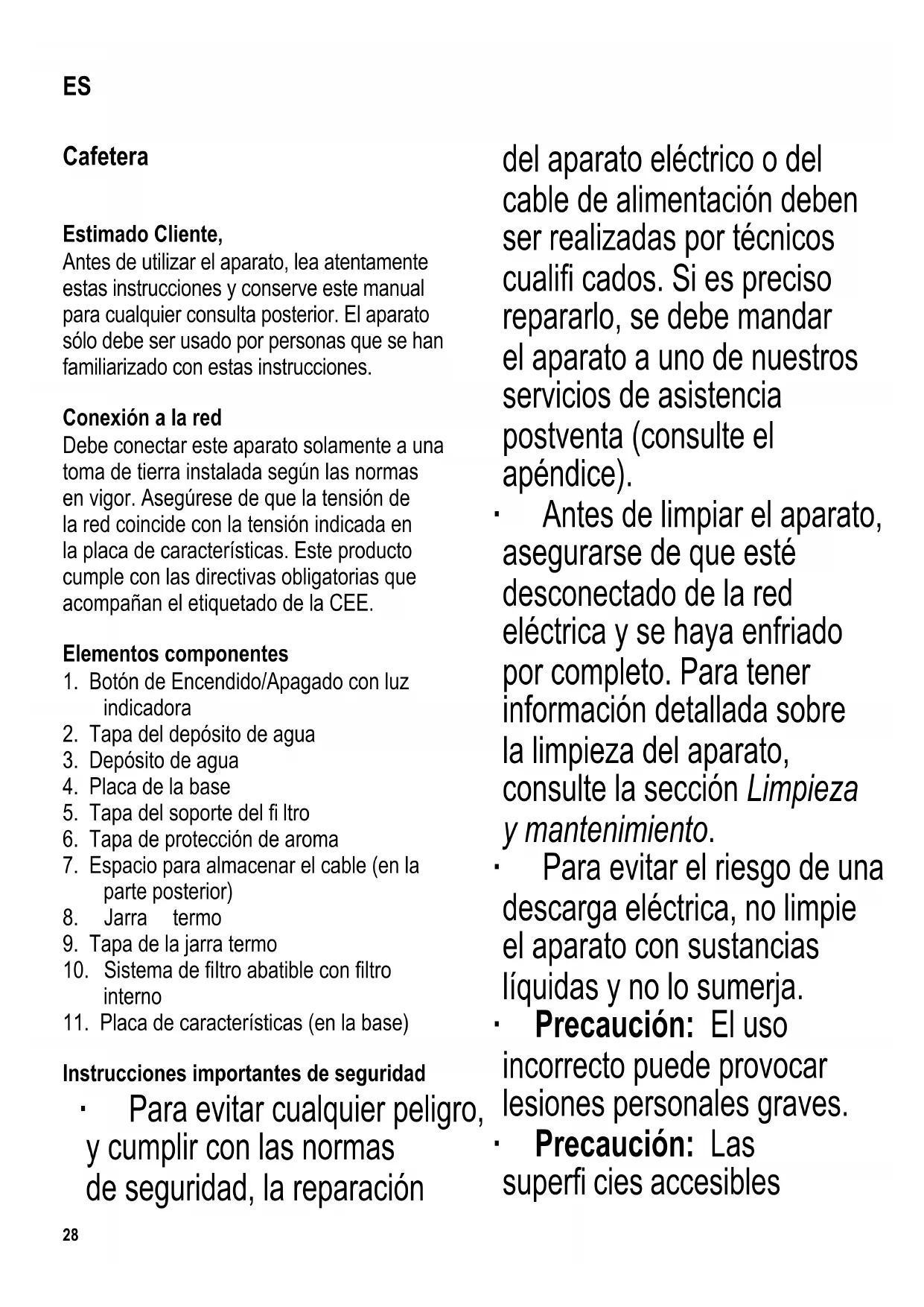 Instrucciones importantes de seguridad ∙ Para evitar cualquier peligro, y cumplir con las normas de seguridad, la reparación del aparato eléctrico o del cable de alimentación deben ser realizadas por técnicos cualifi cados. Si es preciso repararlo, se debe mandar el aparato a uno de nuestros servicios de asistencia postventa (consulte el apéndice). ∙ Antes de limpiar el aparato, asegurarse de que esté desconectado de la red eléctrica y se haya enfriado por completo. Para tener información detallada sobre la limpieza del aparato, consulte la sección Limpieza y mantenimiento. ∙ Para evitar el riesgo de una descarga eléctrica, no limpie el aparato con sustancias líquidas y no lo sumerja. ∙ Precaución: El uso incorrecto puede provocar lesiones personales graves. ∙ Precaución: Las superfi cies accesibles ES29 se calientan durante el funcionamiento del aparato y se mantendrán calientes durante cierto tiempo después. ∙ Este aparato ha sido diseñado para el uso doméstico u otra aplicación similar, por ejemplo - en cocinas de personal, en ofi cinas y otros puntos comerciales, - en empresas agrícolas, - por los clientes de hoteles, pensiones, etc. y alojamientos similares, - en casas rurales. ∙ Este aparato podrá ser utilizado por niños (mayores de 8 años) y personas con reducidas facultades físicas, sensoriales o mentales, o sin experiencia ni conocimiento del producto, siempre que hayan recibido la supervisión o instrucciones referentes al uso del aparato y entiendan por completo el peligro y las precauciones de seguridad. ∙ Los niños no deben jugar con el aparato. ∙ No se debe permitir que los niños realicen ningún trabajo de limpieza o mantenimiento del aparato a menos que esté bajo vigilancia y tengan más de 8 años. ∙ El aparato y su cable eléctrico siempre se deben mantener fuera del alcance de niños menores de 8 años. ∙ Precaución: Mantenga a los niños alejados del material de embalaje, porque podría ser peligroso, existe el peligro de asfi xia. ∙ Antes de utilizar el aparato, siempre se debe comprobar que tanto la unidad principal, el cable de alimentación como cualquier accesorio no están defectuosos. En caso de que el aparato haya caído sobre una superfi cie dura, o se haya tirado en exceso del cable de alimentación, no se deberá utilizar de nuevo: incluso los desperfectos no visibles pueden tener efectos adversos sobre la seguridad en el uso del aparato. ∙ Durante su operación, la cafetera deberá hallarse en una superfi cie plana y no30 deslizante, no porosa para salpicaduras o las manchas. ∙ Evite que la unidad o el cable de alimentación entren en contacto con superfi cies calientes o fuentes de calor. ∙ No deje el aparato sin vigilar durante su funcionamiento. ∙ Para evitar el peligro de emisión de agua caliente o vapor, apague siempre la cafetera y permita que se enfríe durante sufi ciente tiempo antes de abrirla o extraer cualquier accesorio o pieza. ∙ Desenchufe siempre el aparato - si hay una avería, - después del uso, y - antes de limpiarlo. ∙ Cuando se desenchufa la clavija de la pared, nunca tirar del cable de alimentación. ∙ No permita que el cable eléctrico cuelgue suelto; se debe mantener el cable sufi cientemente alejado de las partes calientes del aparato. ∙ No se acepta responsabilidad alguna si hay averías a consecuencia del uso incorrecto del aparato o si estas instrucciones no han sido observadas debidamente. ∙ Precaución: El depósito de agua se calienta durante el funcionamiento. Primer uso ∙ Antes de hacer café la primera vez, haga funcionar el aparato durante dos o tres ciclos de fi ltración utilizando la cantidad máxima indicada de agua, pero sin utilizar café molido. Esto también debería realizarse cuando no se ha utilizado el aparato durante un largo periodo de tiempo, y después de eliminar los depósitos de cal. Elaboración de café ∙ Abra el soporte del fi ltro abatible y extraiga la tapa del soporte del fi ltro. ∙ Introduzca un fi ltro de papel de tamaño-4 en el fi ltro interno, doblando primero los lados perforados del fi ltro. ∙ Le recomendamos utilizar café fi namente molido: ∙ para tazas de tamaño normal deberá utilizar aproximadamente 6 g (= 2 cucharadas de postre) de café molido; ∙ para tazas pequeñas utilice aproximadamente 4g (= 1½ cucharada de postre.) ∙ Dependiendo de sus preferencias personales puede ajustar la cantidad de café molido utilizada. ∙ Vuelva a colocar la tapa del soporte del fi ltro y cierre el fi ltro abatible. ∙ Abra la tapa del recipiente de agua y añada la cantidad deseada de agua fría, respetando la señal mínima (2 tazas). ∙ Las dos escalas de gradación de la válvula le ayudarán a añadir la cantidad correcta de agua: ∙ escala izquierda para tazas de tamaño normal (aprox. 125 ml). ∙ escala derecha para tazas pequeñas. ∙ Precaución: No exceda el nivel máximo de agua correspondiente a 8 tazas de tamaño mediano porque al hervir el agua podría derramarse. ∙ Cierre la tapa del depósito de agua. Es importante porque el sistema Vapotronic solo funcionará con la tapa cerrada ∙ Coloque la tapa de protección de aroma en la jarra termo, y después coloque la jarra termo sobre la placa de la base. ∙ Pulse el botón de Encendido/Apagado; la luz indicadora se encenderá y la cafetera31 comenzará a calentarse. Con el depósito de agua lleno hasta el nivel máximo, el agua tardará aproximadamente 5 minutos en hervir. ∙ Cuando la cafetera alcance la temperatura óptima de elaboración de café, la válvula se abrirá y comenzará el proceso de elaboración de café. ∙ El sistema Vapotronic automáticamente apagará el proceso de calentamiento. ∙ El café comenzará a salir por el fi ltro y caerá dentro de la jarra termo. ∙ La luz indicadora se apagará cuando el ciclo de elaboración de café haya fi nalizado. ∙ El ciclo de elaboración de café se puede interrumpir volviendo a p